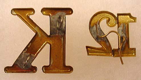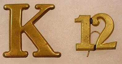 CIVIL WAR ERA REGIMENTAL NUMBER AND COMPANY INSIGNIA - 12th Regiment Troop K. Letter with Orig. Wires