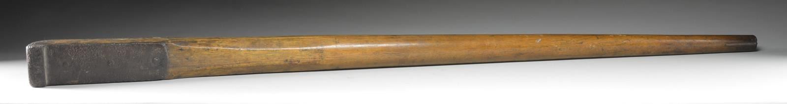 60" Overall walnut pole w/ metal hook used for maneuvering mortars & heavy cannons. Head of spike has sticker w/ retail price. CONDITION: Fair intact wood finish w/ heavy gouges towards head. Metal is brown patina & heavily pitted. (02-16315-1/MD). $300-400.