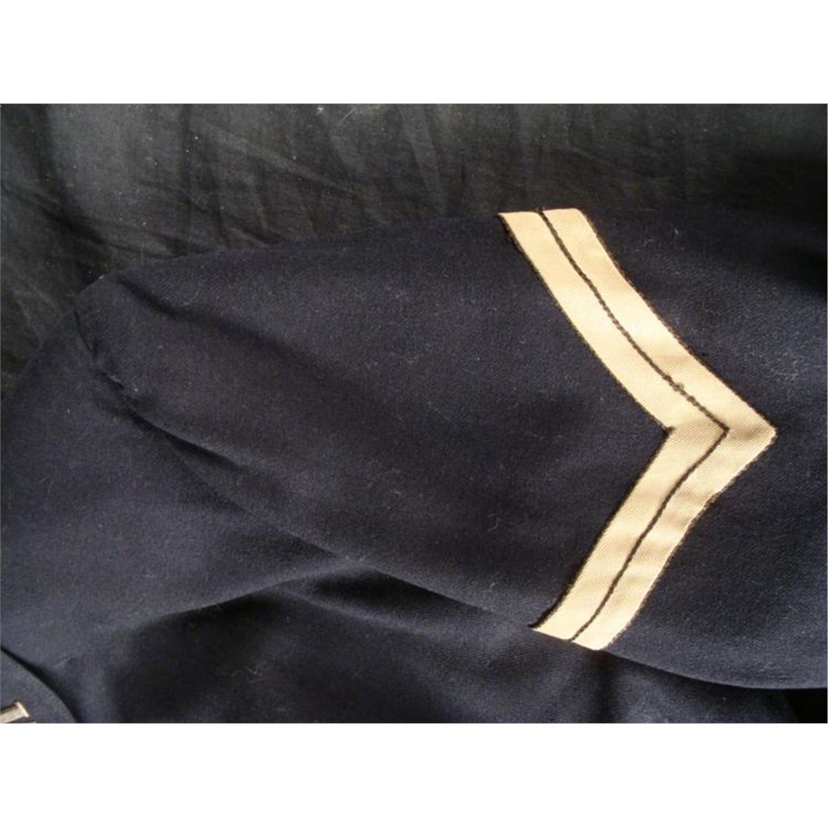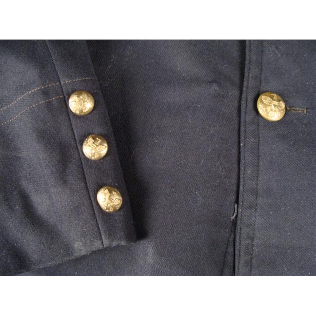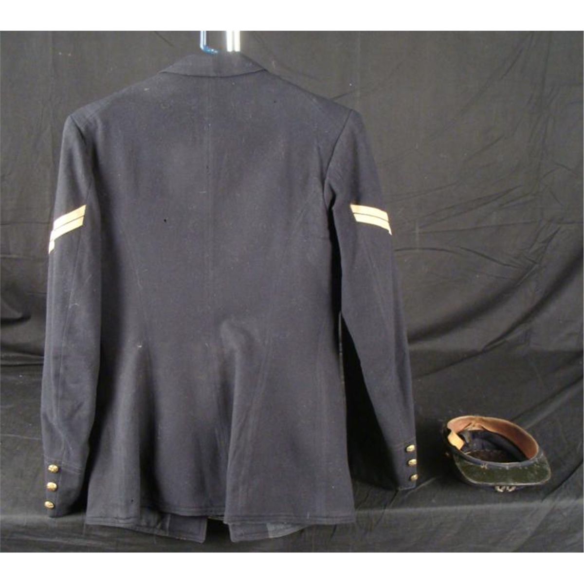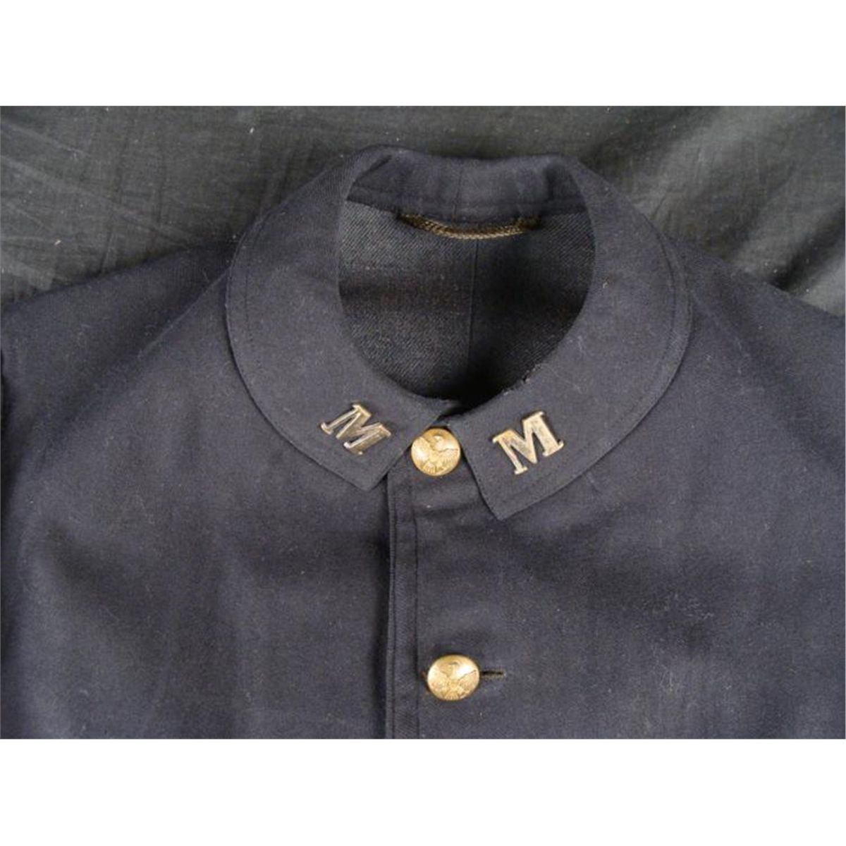 OFFERED HERE AN ORIGINAL TUNIC AND FORAGE CAP FROM THE MASSACHUSETTS MILITIA. IT WAS PROBABLY FROM THE SPANISH AMERICAN WAR OR CIVIL WAR ERA. THE TUNIC HAS A 5 INFANTRY BUTTON FRONT. THE BUTTONS HAVE AN EAGLE WITH SHIELD IN THE CENTER. THE MATERIAL IS A DARK BLUE WOOL WITH A COLLAR THAT HAS A SILVER TARNISHED "M" ON EACH SIDE. BELOW THE FRONT BUTTONS ARE 2 CLOSING CLASPS THAT HOOK TO THREADS. THERE ARE 2 CORPORAL RANK CHEVERONS ON EACH SLEEVE. THE RIGHT CHEVRON IS SLIGHTLY LOOSE AT THE POINT. THERE ARE 3 EAGLE SHIELD BUTTONS ON EACH CUFF. THE INSIDE LINING IS A MEDIUM BLUE TWILL MATERIAL WITH ONE POCKET. THE TUNICS BACK HAS A TRIPLE SEAM. THE FORAGE CAP IS A MATCHING DARK BLUE. IT HAS AN "M" IN A WREATH ON THE FRONT, WITH A LEATHER CHINSTRAP AND A SIDE BUCKLE. THE ENDS HAVE SIMILIAR MATCHING BUTTONS TO THE TUNIC. THE BRIM IS A STIFF LEATHER AND INSIDE THE CAP IS A SWEATBAND. THE SWEAT BAND IS SEPARATED INTO PARTS WITH PART OF THE LINING STILL INTACT. THE CROWN HAS A STIFF MATERIAL WITH AN OILCLOTH COVERING. WE HAVE DESCRIBED AND IDENTIFIED THIS GREAT UNIFORM IN DETAIL TO THE BEST OF OUR ABILITY; A FANTASTIC OFFERING!! *