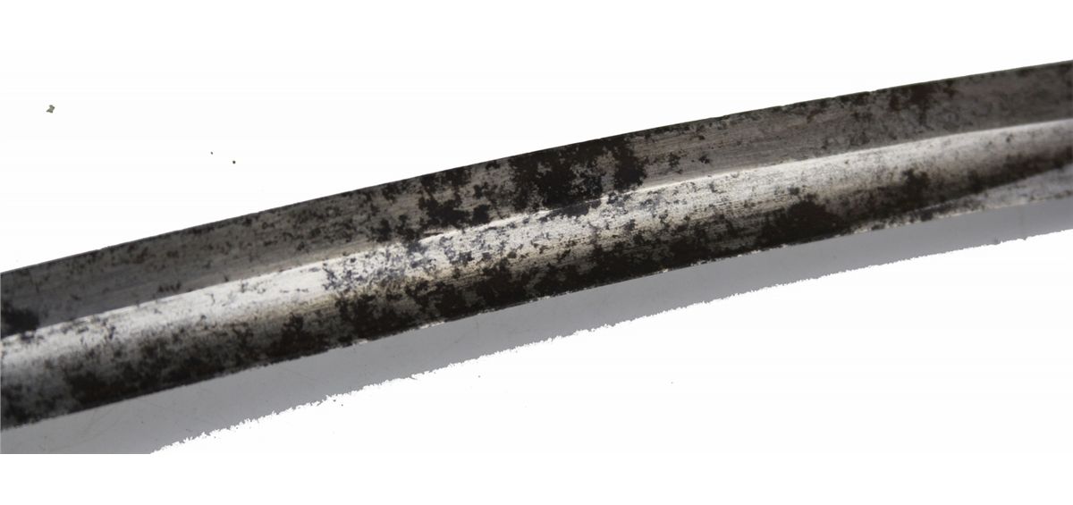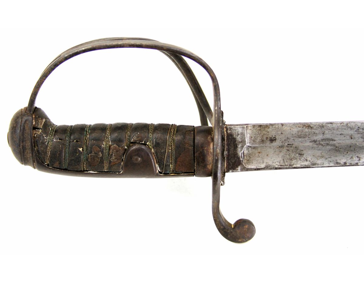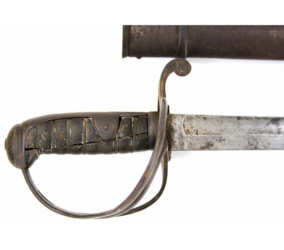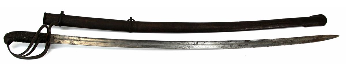 CIVIL WAR ERA UNMARKED CAVALRY SABER Civil War era unmarked cavalry saber. 35.5 inch curved blade with broad fuller. Iron hilt with wire wrapped leather over wood grip. No markings on blade or hilt. Metal scabbard with two hang rings. Type: Sword Country: US Blade Length: 35.5 inches Condition: Mottled grey patina to blade, with darker brown patina to hilt. Most of leather grip remains. Dark mottled brown patina and some surface rust to scabbard, with several dings.