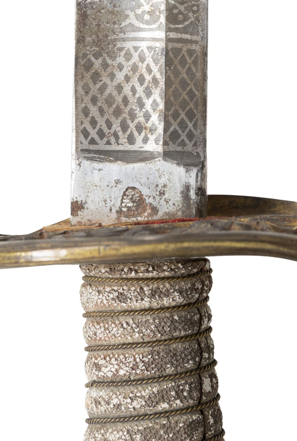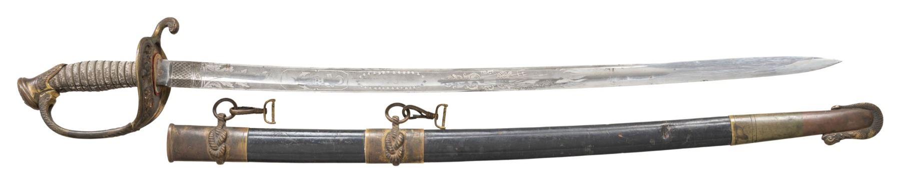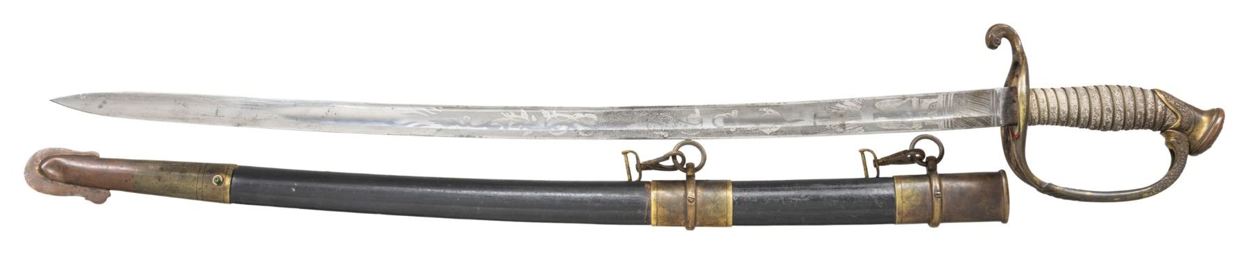 A fine Civil war period U.S. Naval officer's sword with an overall length of 35 3/8" and a blade length of 27 5/8". The etched blade has a single wide fuller and is decorated with various naval, patriotic, and foliate motifs. The only makers mark at the ricasso is a beehive. Gilded brass hilt with a pierced guard showing the letters USN amongst oak leaves and acorns. Wire wrapped whitened sharkskin grip with a gilded brass mounted leather scabbard. CONDITION: blade has substantial original factory polish and the hilt retains traces of its original gilded finish, The grip is worn but complete and the wire is 100%. The scabbard mounts have traces of original gilded finish and the body is solid but has a small hole near the drag. The screw on the drag is replaced and the dolphin at the tip is a bit bent. (02-24104/BF). NON-GUN. $800-1,200.