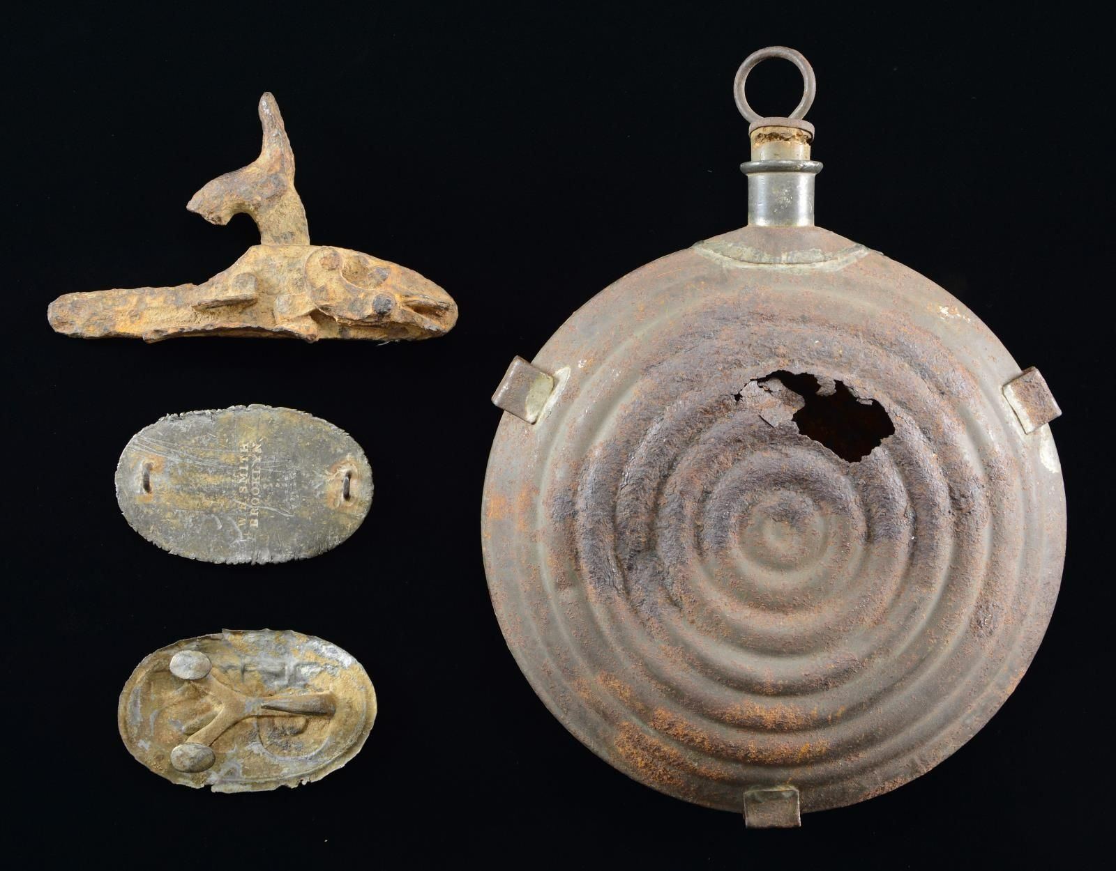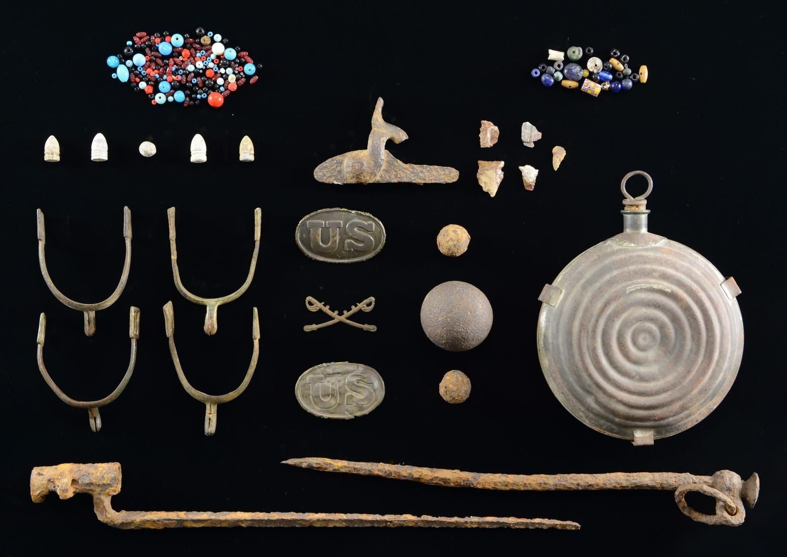 This group includes 1 Enfield bayonet. / 1 Canteen with a 2” hole in one side. / 1 Picket pin. / 2 Grapeshot. / 1 Cannonball measuring 2 1/2". / 4 Spurs. / 1 US oval box plate with hooks marked on the reverse “W.H. SMITH BROOKLYN. / 1 US oval belt plate with puppy paw hooks but no lead. / 1 M1872 crossed sabers hat insignia. / 1 Musket lock. / 5 Bullets. / 1 Small container of flint sherds. / 2 Pill bottles containing a variety of Native American beads in various colors, shapes, & sizes. CONDITION: items are excavated & have crusty, rusty patinas. PROVENANCE: From the Lifelong Collection of Glen E. Mattox. (02-18720/BF). $400-600.