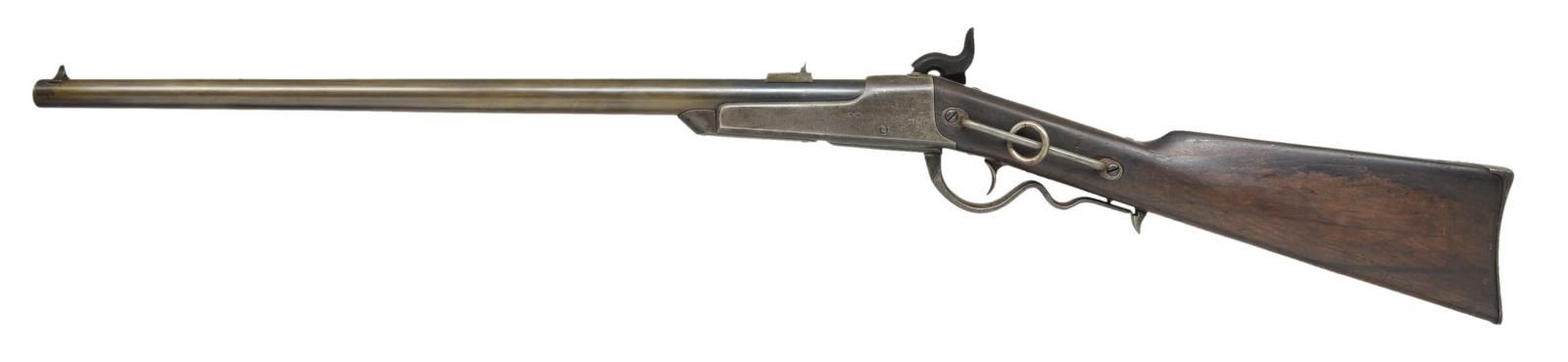 CARBINE. Cal. 50. S# 23296. Bbl. 22". Standard configuration of popular Civil War lever action carbine, all iron mounted including patchbox, lock marked “GALLAGHER’S PATENT / JULY 17TH 1860” & “MANUFACT’D BY / RICHARDSON & OVERMAN / PHILADA” & serial number 23296. CONDITION: very good to fine overall as refinished, complete & original, metal overall smooth gray/patina. Stock is sound, well fit w/ no discernible cartouche. Mechanically fine w/ bright shiny bore. (01-19451/JS). ANTIQUE. $800-1,200.