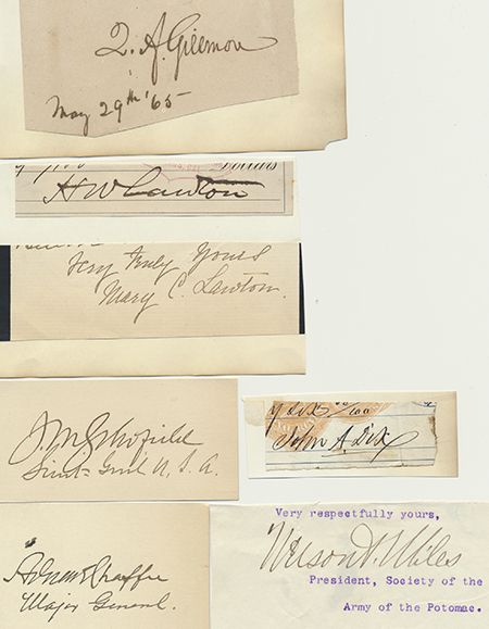 A nice lot of six signatures of generals, each on a small sheet and mounted, includes: JOHN A. DIX, H. W. LAWTON, QUINCY ADAMS GILLMORE, JOHN M. SCHOFIELD, NELSON A. MILES, ADNA CHAFEE. Very good.