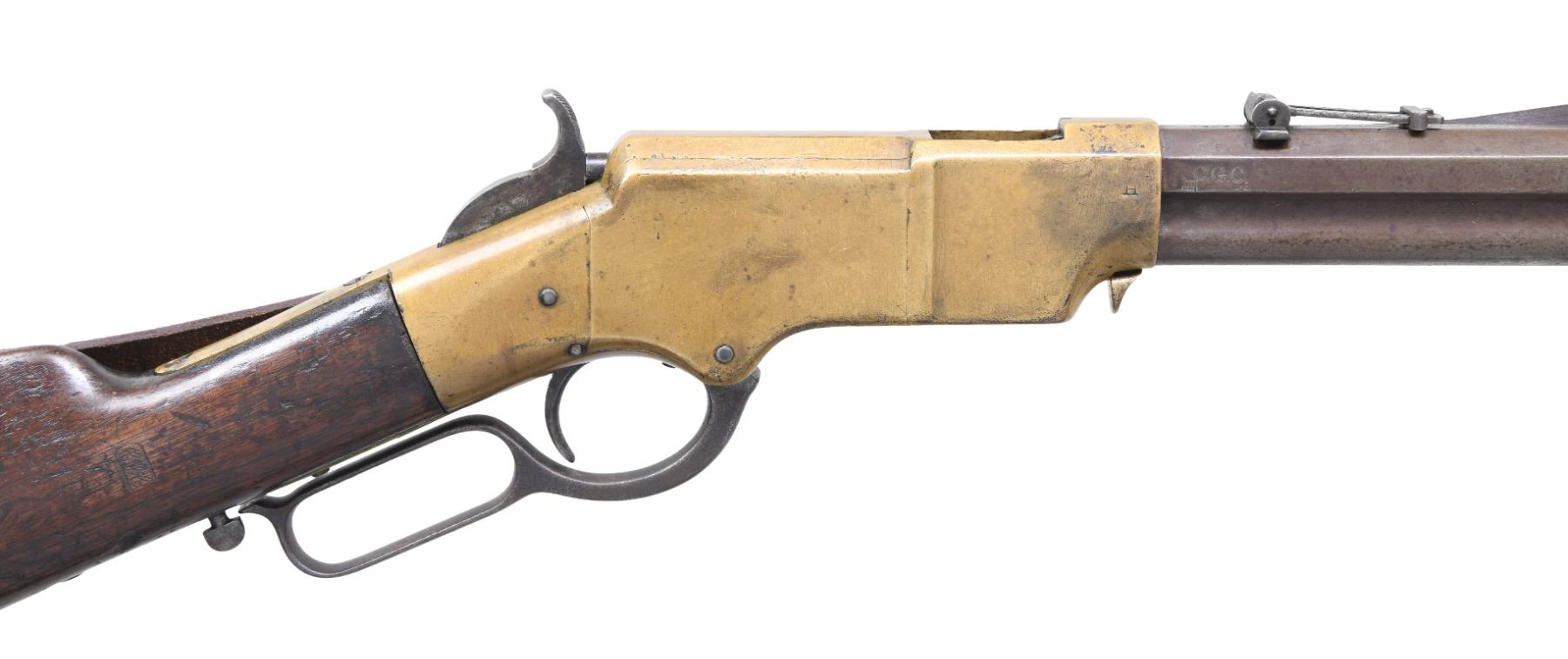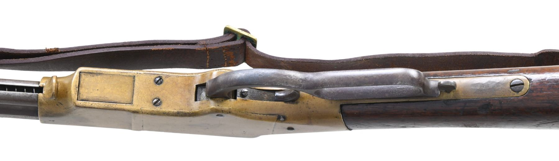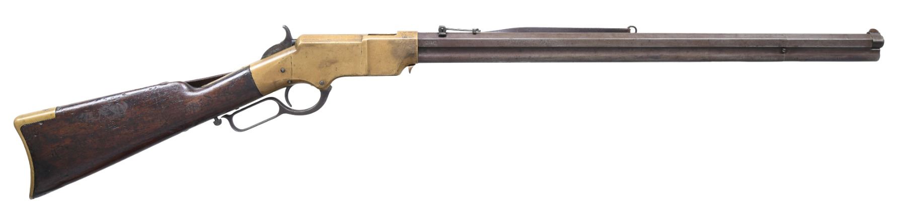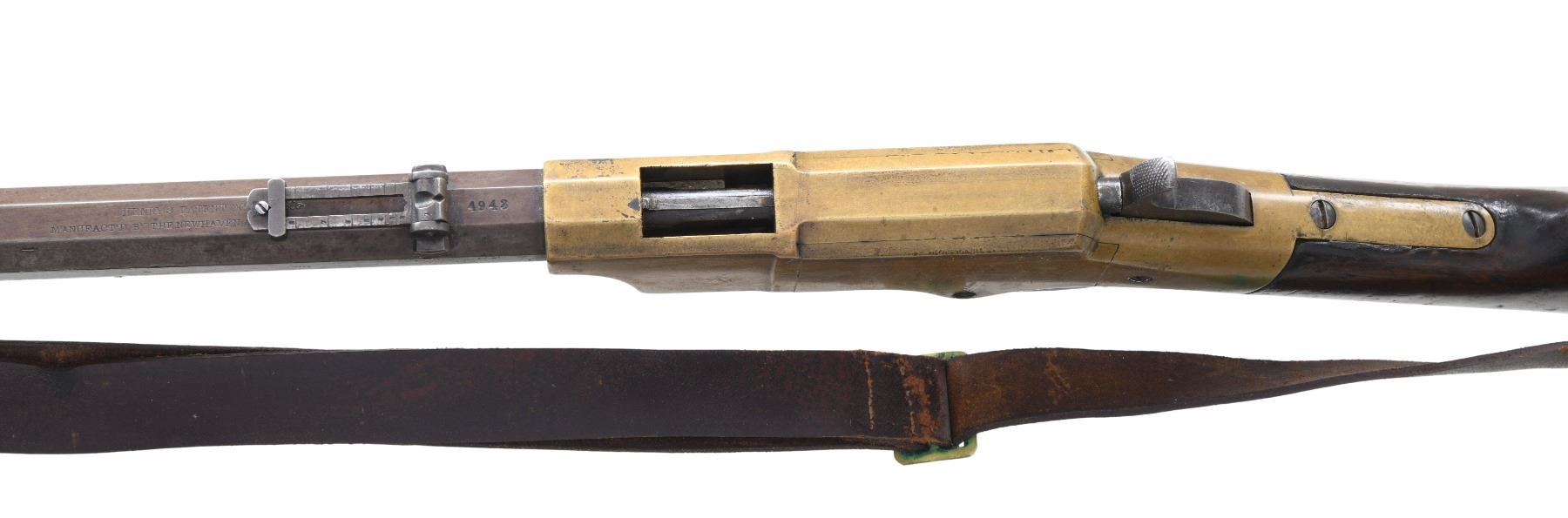 Cal 44. S# 4943. This is a good complete 4th variation Henry which encompasses all the early martials and range from about S# 3000-5000. Characteristics of this early 1864 manufactured rifle include 1st type rounded butt plate with 7/8" trap door, .65" hole bored in the butt stock to accept the original 4-piece iron cleaning rod which started around S# 4000, just after the 1st martial guns for DC Cavalry. Trigger retaining pin is still the small .095 diameter which enlarges about S# 5000, lever latch on lower receiver tang and latch flange on rear of lever, has a milled flat along the magazine follower slot in lower front of receiver, large magazine follower with 5/8" wide finger tab, square back front sight blade, slanted profile to stock comb, straight profile to lower edge of stock, no discernible "Henry bump" on oil finished stock, large 3.25" all serif font barrel address which stared about S# 3500 till end of production, sight dovetail milled in barrel only, six groove rifling, 900 yard rear sight with slide stop screw, sling swivels on left side. Serial number stamped on following parts: barrel behind rear sight dovetail, left side of lower receiver tang, top receiver tang channel in butt stock, inside bottom edge of butt plate, shanks of butt plate screws, the three tang screws are no longer numbered. Matching assembly numbers stamped on rounded portion of barrel under loading sleeve and on rear edge of loading sleeve. There is "H" stamped rear of lever latch in tang. Attached is brown leather sling "HENRY'S PATENT RIFLE / patented Oct 16, 1860". CONDITION: very good overall, appears complete and original. Brass has light mustard patina, iron is overall smooth mottled plum/brown patina, crisp address & serial number. There is spurious martial cartouche stamped in stock and initials in frame/barrel interface on right side, these added marks should be removed by gunsmith as the gun is very honest and complete otherwise. Sound, well fit stock with newer varnish finish. Mechanically fine, good discernible rifled bore. 4-piece iron & brass cleaning rod is very good. (01-26380/JS). ANTIQUE. $10,000-15,000.