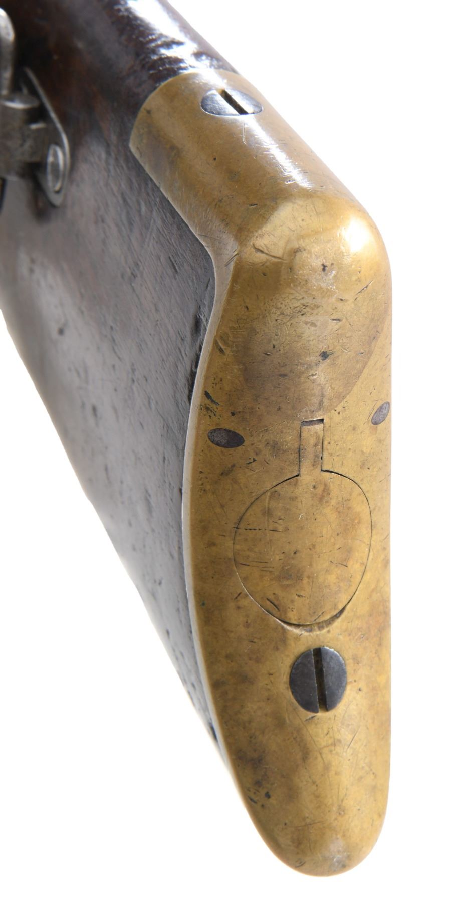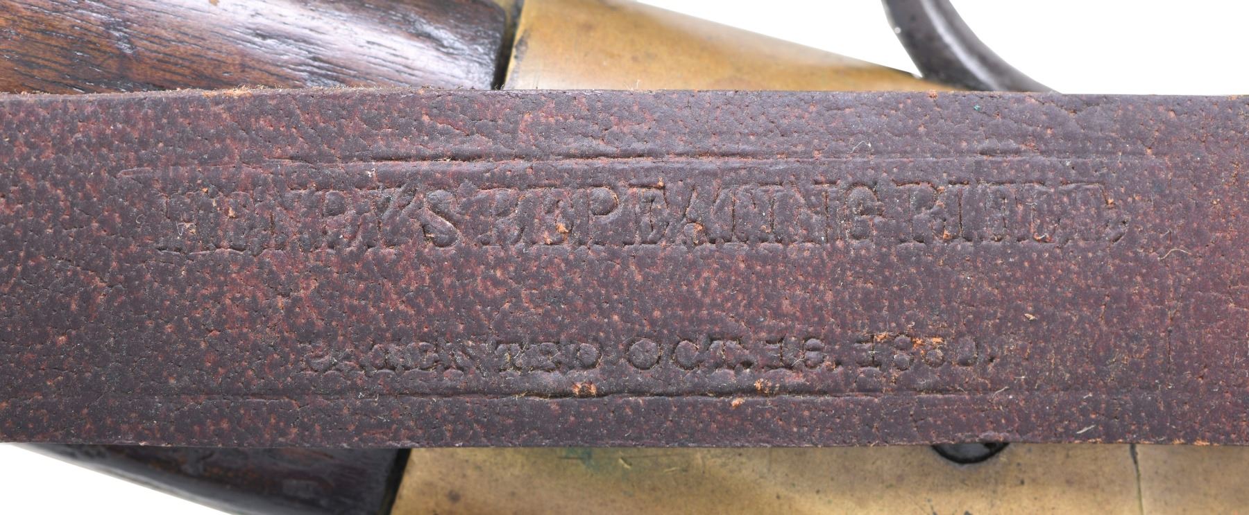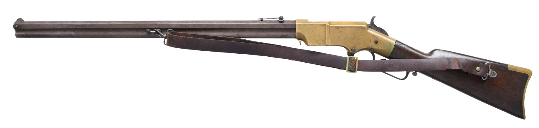Cal 44. S# 4943. This is a good complete 4th variation Henry which encompasses all the early martials and range from about S# 3000-5000. Characteristics of this early 1864 manufactured rifle include 1st type rounded butt plate with 7/8" trap door, .65" hole bored in the butt stock to accept the original 4-piece iron cleaning rod which started around S# 4000, just after the 1st martial guns for DC Cavalry. Trigger retaining pin is still the small .095 diameter which enlarges about S# 5000, lever latch on lower receiver tang and latch flange on rear of lever, has a milled flat along the magazine follower slot in lower front of receiver, large magazine follower with 5/8" wide finger tab, square back front sight blade, slanted profile to stock comb, straight profile to lower edge of stock, no discernible "Henry bump" on oil finished stock, large 3.25" all serif font barrel address which stared about S# 3500 till end of production, sight dovetail milled in barrel only, six groove rifling, 900 yard rear sight with slide stop screw, sling swivels on left side. Serial number stamped on following parts: barrel behind rear sight dovetail, left side of lower receiver tang, top receiver tang channel in butt stock, inside bottom edge of butt plate, shanks of butt plate screws, the three tang screws are no longer numbered. Matching assembly numbers stamped on rounded portion of barrel under loading sleeve and on rear edge of loading sleeve. There is "H" stamped rear of lever latch in tang. Attached is brown leather sling "HENRY'S PATENT RIFLE / patented Oct 16, 1860". CONDITION: very good overall, appears complete and original. Brass has light mustard patina, iron is overall smooth mottled plum/brown patina, crisp address & serial number. There is spurious martial cartouche stamped in stock and initials in frame/barrel interface on right side, these added marks should be removed by gunsmith as the gun is very honest and complete otherwise. Sound, well fit stock with newer varnish finish. Mechanically fine, good discernible rifled bore. 4-piece iron & brass cleaning rod is very good. (01-26380/JS). ANTIQUE. $10,000-15,000.