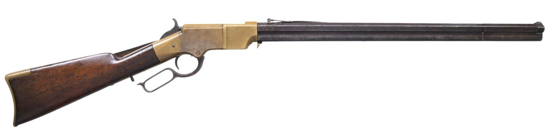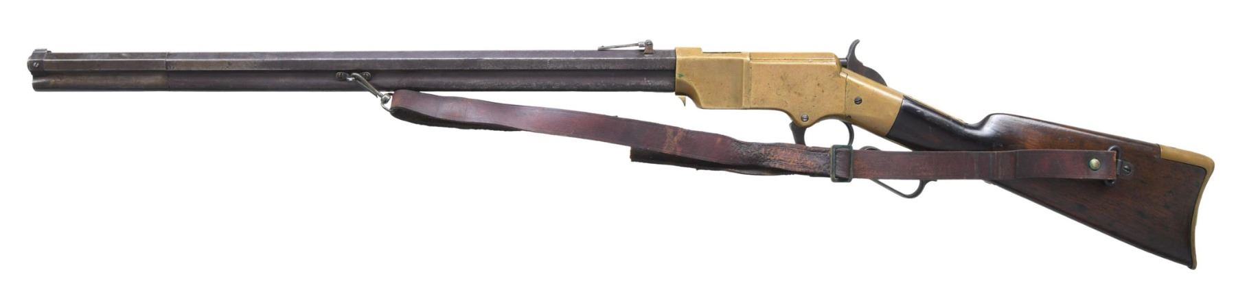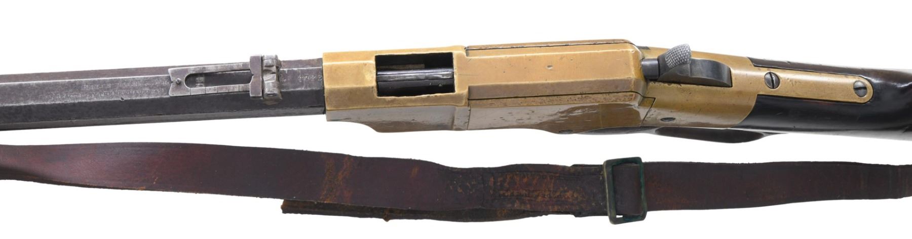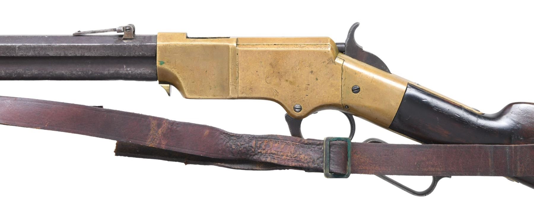 Cal. 44. S# 4723. Standard configuration of the 4th variation which includes rifles between serial number 3000-5000, and includes all the DC cavalry martials which run ~3000 to 4000. Large font barrel address with all serif letters transitions about S# 3500. About 500 commercial guns were made in the serial range that would make it to the field for rounded 1st type butt plate with large trap door but with the smaller .65" diameter bored mortise for the iron cleaning rods which take less space, starting after martials at about S# 4000. Butt plates will change to 2nd type with pointed edge and smaller trap door for the smaller iron rods. 900yd rear sight has stop screw for slide which transitioned after S# 4000 also. Sling swivels on left side. Serial number stamped on following parts: barrel behind rear sight dovetail, left side of lower receiver tang, top receiver tang channel in butt stock, inside bottom edge of butt plate, the three tang screws are unnumbered and buttplate screws unnumbered, which is not the norm. Regardless, rifle appears original and complete from its time of use.CONDITION: good-very good overall, good markings, barrel has mottled plum/gray patina. Brass has toned patina, stock refinished and varnished, mechanics functional, worn dark rifled bore front sight trimmed. Accompanying leather slang with brass buckle is broken but complete. (01-26378/JS). ANTIQUE. $9,000-14,000.