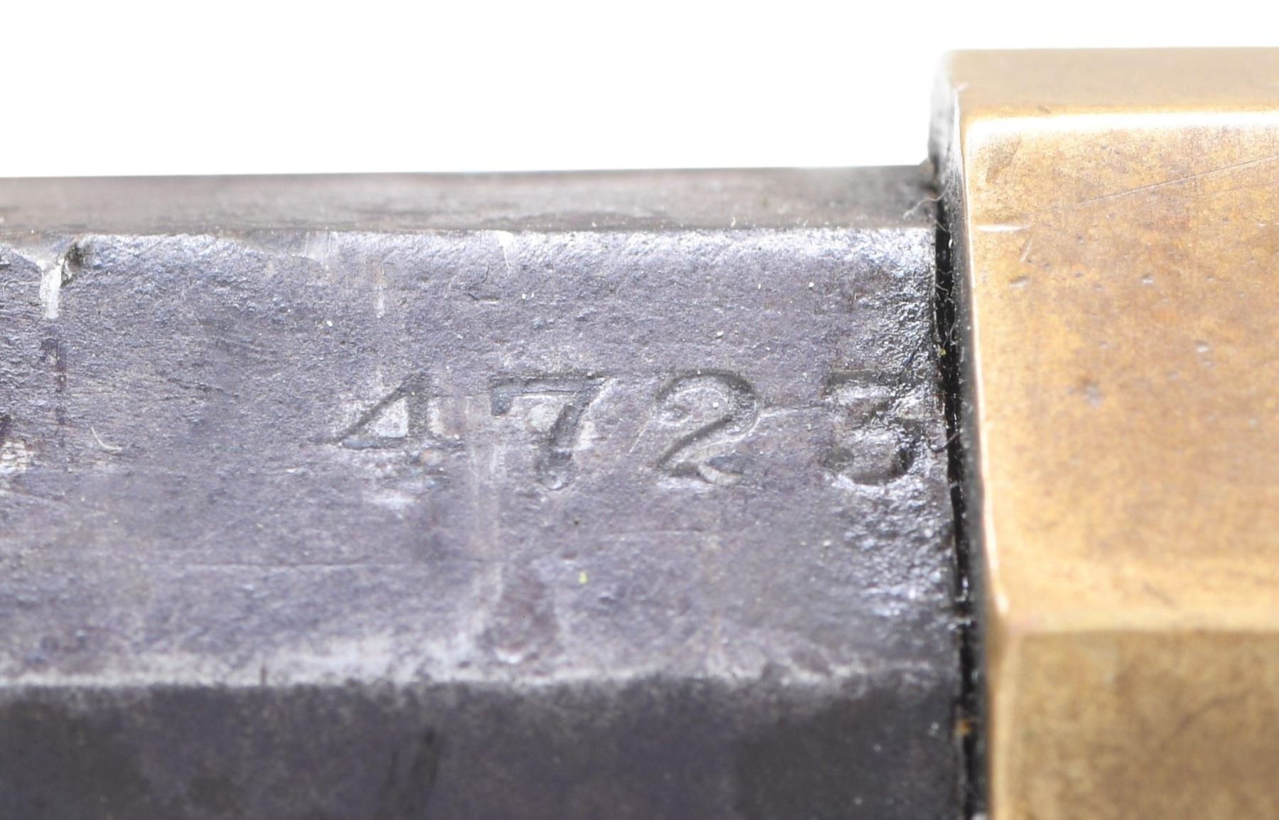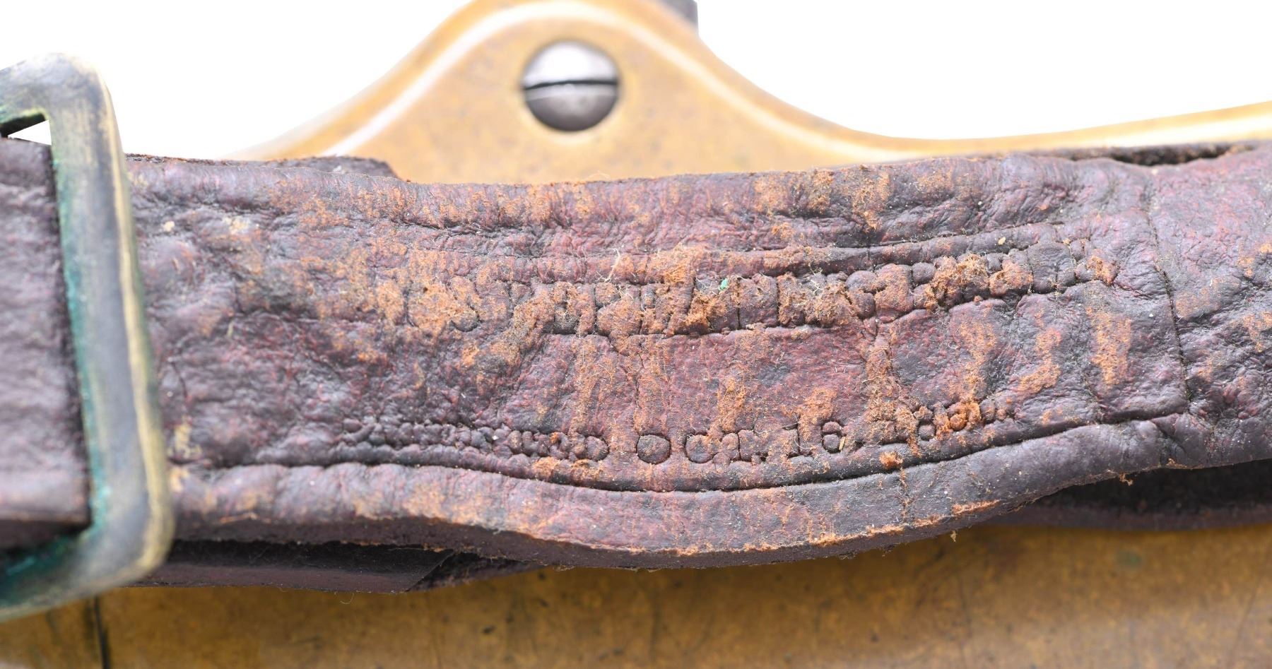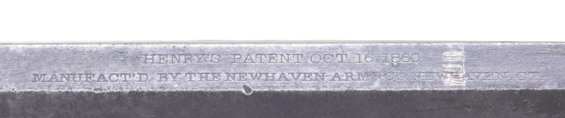 Cal. 44. S# 4723. Standard configuration of the 4th variation which includes rifles between serial number 3000-5000, and includes all the DC cavalry martials which run ~3000 to 4000. Large font barrel address with all serif letters transitions about S# 3500. About 500 commercial guns were made in the serial range that would make it to the field for rounded 1st type butt plate with large trap door but with the smaller .65" diameter bored mortise for the iron cleaning rods which take less space, starting after martials at about S# 4000. Butt plates will change to 2nd type with pointed edge and smaller trap door for the smaller iron rods. 900yd rear sight has stop screw for slide which transitioned after S# 4000 also. Sling swivels on left side. Serial number stamped on following parts: barrel behind rear sight dovetail, left side of lower receiver tang, top receiver tang channel in butt stock, inside bottom edge of butt plate, the three tang screws are unnumbered and buttplate screws unnumbered, which is not the norm. Regardless, rifle appears original and complete from its time of use.CONDITION: good-very good overall, good markings, barrel has mottled plum/gray patina. Brass has toned patina, stock refinished and varnished, mechanics functional, worn dark rifled bore front sight trimmed. Accompanying leather slang with brass buckle is broken but complete. (01-26378/JS). ANTIQUE. $9,000-14,000.