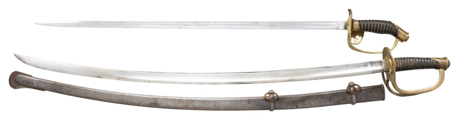 1) CAVALRY SABER. A very good example35 3 of a Civil War era imported M1840 style enlisted cavalry saber measuring 43 1/2" overall with a 35 3/8" plain blade. The blade has no maker's marks and shows a single wide fuller and a secondary fuller near the spine. Standard 2 branch brass hilt with a wire wrapped leather grip and iron scabbard. CONDITION: blade has a pleasing light gray patina. Hilt shows light wear and scabbard has a lightly mottled gray patina. 2) PRUSSIAN SWORD. A good example of an Imperial German officer's sword from Prussia measuring 37 3/4" overall with a 31 3/4" double fullered blade marked " (king's head)(knight's head) W. K. & C ". Gilded brass hilt with folding Prussian eagle guard. Single branch guard with a canted pommel. Wire wrapped composite grip with a crowned cipher on one side. No scabbard. CONDITION: blade has a light gray patina. Hilt shows light wear overall with noticeable loss of gilding. (02-24442-2/BF). $400-600.