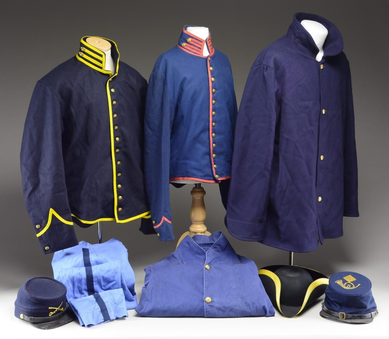 This group consists of 1 Civil War reenactor’s 4-button sack coat with correct style buttons. / 1 Civil War reenactor’s artillery shell jacket with Indian War period buttons. / 1 Civil War reenactor’s cavalry shell jacket with Indian War officer’s buttons. / 1 Indian War 4-button blue shirt with Infantry Seargent stripes. / 1 Pair of blue trousers with dark blue stripes down the side. / 1 Civil War style kepi for the 5th Infantry of the 15th Corps. / 1 Indian War style kepi for the Cavalry. / 1 Colonial tricorn hat. CONDITION: all items show light wear, with the exception of the Indian War shirt that is torn in both armpits. PROVENANCE: From the Lifelong Collection of Glen E. Mattox. (02-18754-1/BF). $200-400.