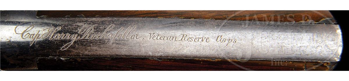 SN 27182. Cal. 32. This is a fine example of the popular Civil War sidearm with 6" bbl in "as found" condition. Presentation engraved on backstrap reads "Capt. Harry Rockafellar, Veteran Reserve Corps". Capt. Rockafellar entered the war April 20, 1861 in Company K of the 71st New York Volunteers. He proceeded to be wounded in his first action at Bull Run July 21, 1861. He was taken prisoner and stayed at Libby Prison until he escaped October 9, 1861. He participated in the Gettysburg campaign, NYC riots and Fort Wagner in 1863. Rockafellar was commissioned Captain in the Veteran Reserve Corps near war's end about the time he received this pistol which accompanying factory letter states was shipped from factory July 11, 1864 to New York City dealer. Rockafellar later became the commander of the 71st New York Regiment and there are accompanying copy photographs of him in uniform as Colonel, commanding 71st Regiment 1869-1871. There is a portfolio of documents detailing Colonel Rockafellar's war time and post-war history. Accompanying this pistol is an orig CDV, 1864, signed "Yours Respectfully, Harry Rockafellar, Capt. 21st V.R.C." The gun has matching assembly numbers, and the SN is stamped on the inside of grip. PROVENANCE: Charles Duffy Collection, David Carroll Collection, Marlan Polhemus Collection. CONDITION: Gun retains about 90% of its orig blue finish on frame and bbl with staining and pitting and balance of metal gray/brown. Cylinder retains about 30% of its bright blue finish with balance brown. Maker and patent marks on bbl flat and cylinder are crisp and easily read as are serial numbers. Rosewood grips are sound and solid retaining almost all their orig varnish with several dings and dents. Mechanically gun functions well with well crisp shiny rifling. Accompanying chamois protective sleeve is sound and supple with staining and soiling. 4-48733 JS64