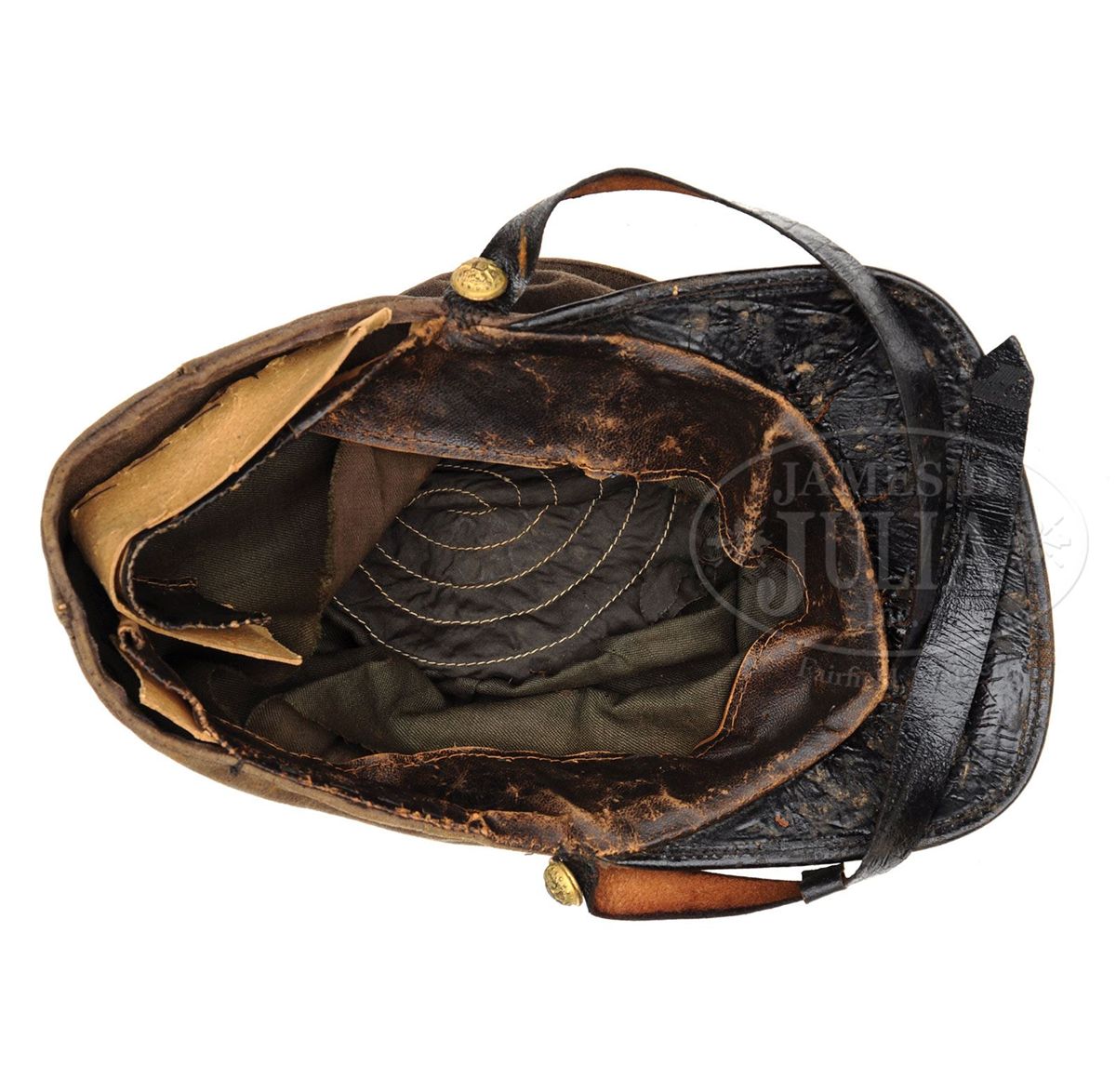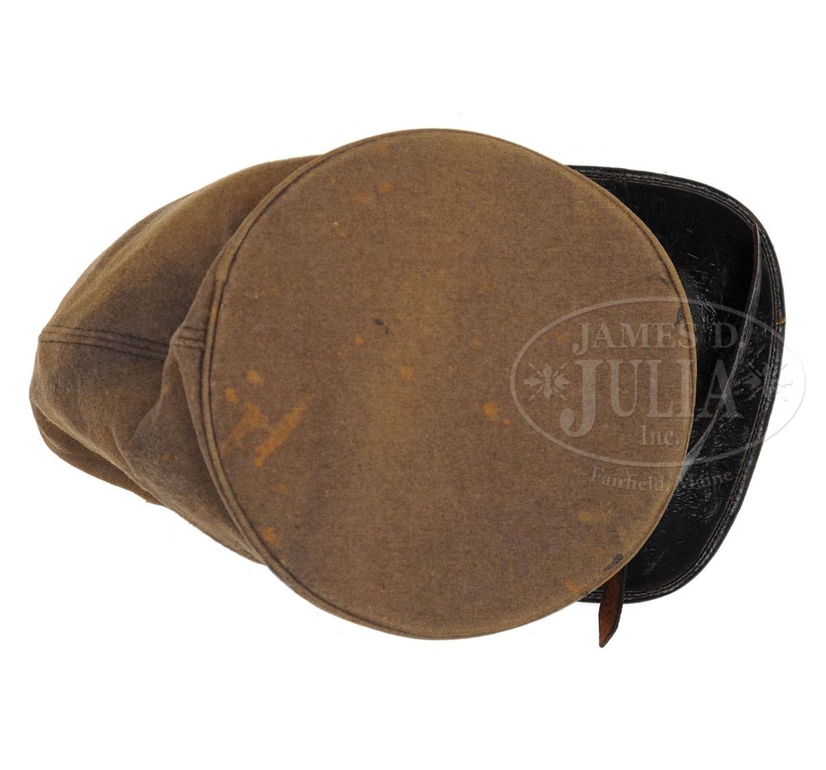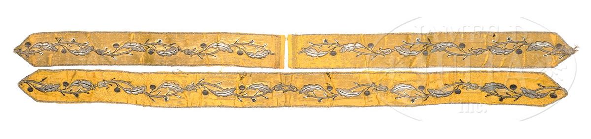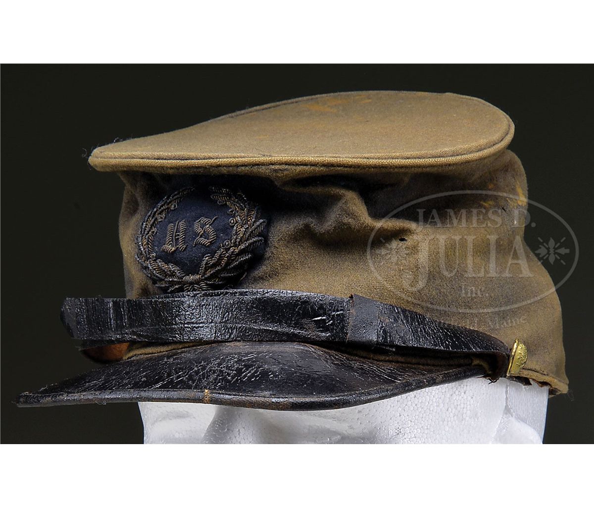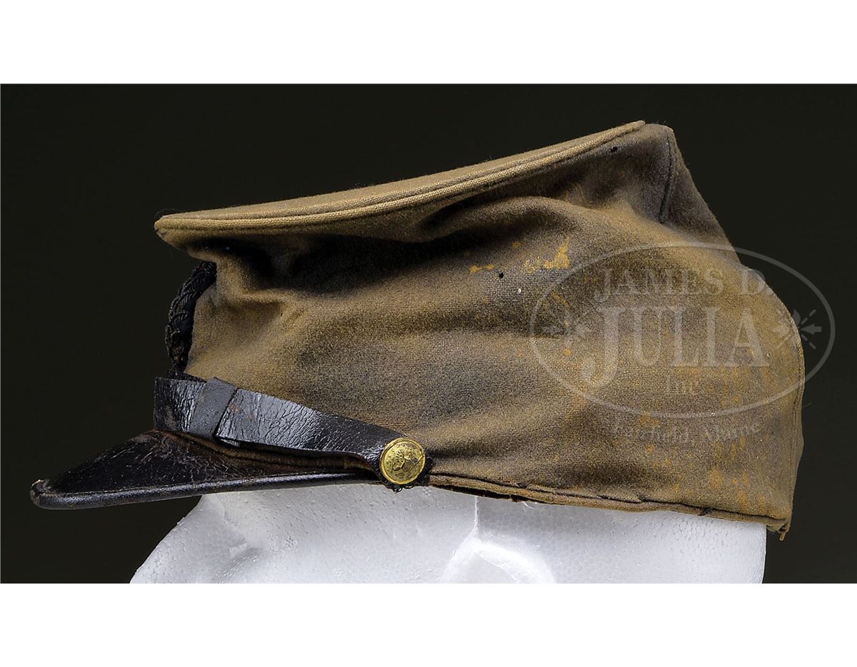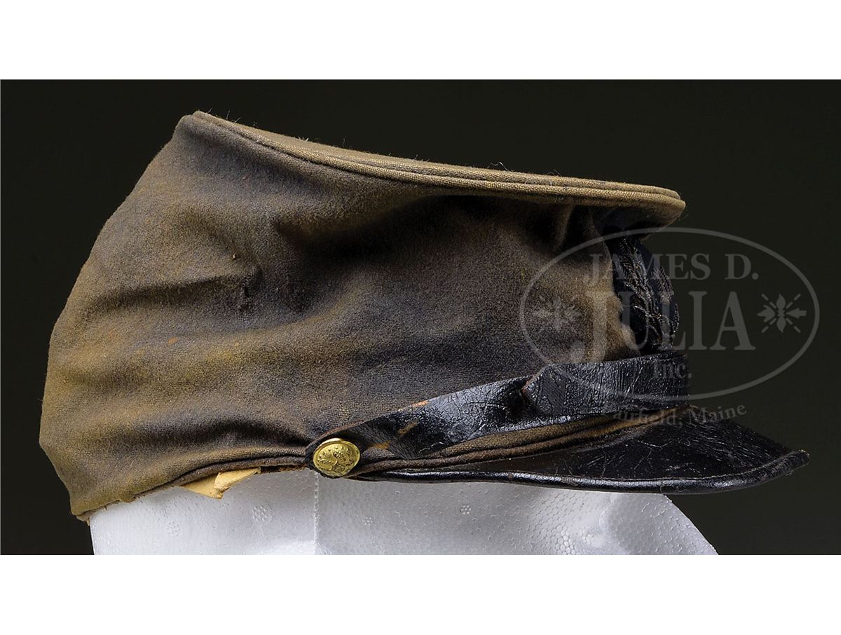 This classic private purchase kepi retains its orig bullion "US" and wreath insignia, as originally applied. This hat is no doubt Civil War, exhibiting features seen on early war hats. Front of hat measures 3-1/2" tall, crown is 6-1/4" dia. Kepi is almost 6-1/2" in back. Patent leather sweatband is 1-3/4" tall with a cardboard stiffener in sweatband and crown. Hat is lined on sides with polished green cotton and in crown with quilted black silk. Sweatband terminates in general staff buttons with Horstmann & Brothers back marked buttons. Visor has tarred linen sewn around edges. Consignor states the provenance to Contract Surgeon James Cheston Morris of Philadelphia. Morris began his practice in 1854 after graduating from University Of Pennsylvania. From October 1862 to August 1863 he served as a contract surgeon in the Army. The kepi is consistent with other identified hats. Accompanying this kepi is what family thought was a sash. It is not anything military that we are aware of, but consists of three pieces of 2-1/2" wide linen backed yellow silk with floral silver bullion designs. One piece measures 39" long, the other two measure about 20" long each. Material appears to be of the Civil War era as far as materials and sewing style. We have no idea what it represents but family preserved it with Civil War kepi. PROVENANCE: Includes a short family biography on the Morris Family from our consignor. CONDITION: Kepi is sound and solid overall with several small moth holes. Kepi has lost most of its orig blue color and is now more of a olive drab with staining and soiling, as can be seen in photos. Kepi has separated for about 5" in front between body and visor. Lining appears mostly intact, though loose and separated. Sweatband is missing about half of its attaching stitches. Chin strap is improperly reattached, but is complete. Bullion 2-1/4" x 1-1/2" staff insignia appears orig to face of kepi. This hat could be easily restored by a good textile conservator as it is complete and solid. The accompanying "sash" has numerous tears and separations in silk. Bullion is mostly intact and linen backing is solid. 4-48868 JS39