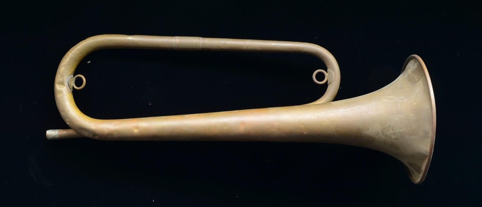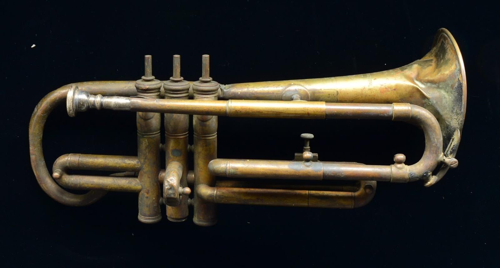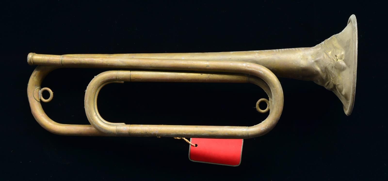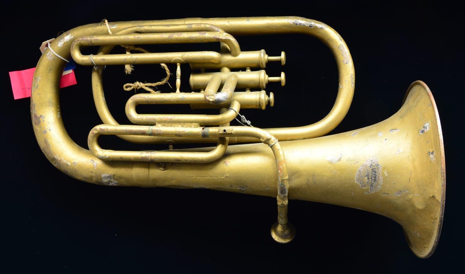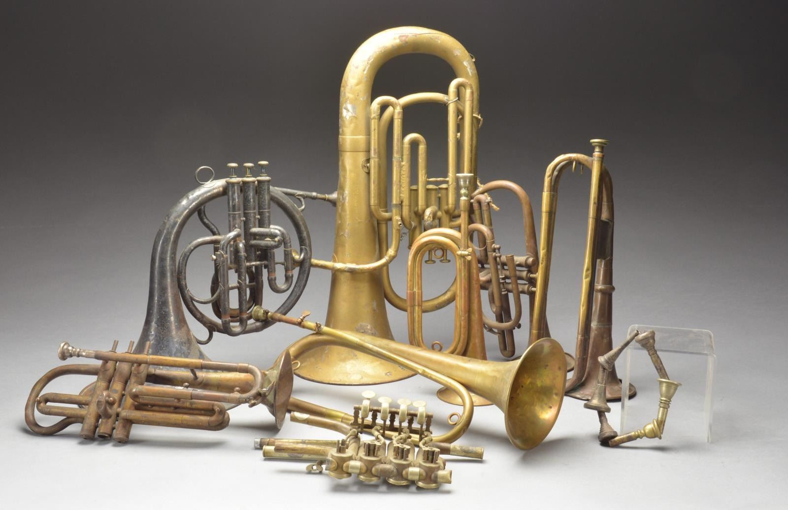 BUGLE & PARTS. 1) CORNET. A sm. cornet measuring 13 1/4" in length & approx. 6" in width. Cornet has 3 valves & has no markings. CONDITION: bell is a bit bent, only 1 valve functions, 1 valve base is missing & there are scattered dents throughout. 2) CORNET. A larger cornet measuring 15 1/2" in length & approx. 6 1/2" in width. Cornet has 3 valves & has no markings. CONDITION: bell is dented & the tube leading to the bell is bent. The 3 valves seem to work well. There are scattered dents throughout the horn. 3) TUBA. A 4 valve tuba measuring approx. 23" in length & approx. 12" in width. Tuba marked, “J.W. PEPPER IMPORTER PHILADELPHIA 25214”. CONDITION: bell has minor dents. There are scattered dents throughout the tuba. Entire tuba has been painted gold. 4) 4 BUGLES. Bugles are of various sizes & periods. CONDITION: most bugles have pieces missing & dents scattered throughout. 5) PARTS. 1 Group of parts for early brass instruments including mouth pieces, slides, keying devices & various tubes. CONDITION: all parts show wear. (02-14221(8)/BF). 6) FRENCH HORN. Horn is silver plated, approx. 15" in size & unmarked. CONDITION: all finger valves function. Horn is in comparatively good shape w/ few dents & no losses. 7) 5 MILITARY BUGLES. Bugles are of various sizes & periods. CONDITION: 2 bugles have significant dents. 3 Show light to moderate wear. (02-14264(6)/BF). $1,000-1,500.