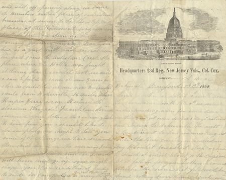 Lot of six war-date letters written by Sgt. William Seed, Co. A, 23rd NJ Infantry, 27pp. total, various sizes, from Oct. 10, 1862 to Mar. 17, 1863, pencil and ink, sent to a lady. In small part: "[Oct. 10, 1862 Bakersville, Md]...we marched...carry 30 rounds of ammunition and 3 days rations...dust about 3 inches deep...many of our men fell out unable to go some are not expected to live long overcome by heat...one of our men took one of his biscuits and killed a snake by pounding him on the head with it...we came to South Mountain pass...we passed many graves all along the road...many shells lay around the trees and fences were all marked with the shot...many rebel graves, some shoes are laying in the woods with the feet in them as they were shot off...came to Antietam Creek...all over graves as close as can be...["On the Battlefield" [Fredericksburg], Dec. 14, 1862]...we have been 3 days under fire. Last evening we were engaged with the Enemy and lost nearly 100 of our men 6 or 7 of our company are wounded. We exepect to be in again every moment our boys do very well...Remember me in your prayers...I will tell you more when the shells stop whistling overhead...[White Oak Church, Christmas, 1862]...the men have little heart to make merry, many of our men are sick or lay dead in the hospital...men lay by hundreds sick and dying...some of our men made a cross of evergreensand fixed it off with candles...Uncle Sam's crackers was subsituted for candy, beef and other things covered it all over...during the fight [at Fredericksburg] we were 3 days under fire all the time laying on the ground in the mud without any covering...this is why so many of our men are dying...[White Oak Church, Jan. 8, 1863]...many changes in our Regt. since the Battle those who showed the white feather being either discharged or resign to save their reputation...our men are still sick nearly every day some die out of the Reg't....two have been taken from our Com'y...[White Oak Church, Feb. 9, 1863]...the men are now getting furlows...nearly every week one dies out of this Reg't, 2 have died this week...we crossed the river, he was missing. The next we heard of him he was at Camp Parole...picketing on the line of battle is rather an unpleasant affair...the men are so near ech other...they often get to firing on each other...[White Oak Church, Mar. 2, 1863]...cold and rain has added to the number of sick in the hospital...have seen much of the evils of the rum shop...think how many a man might be reclaimed from a drunkard's grave...our new commander...is already making improvements in the discipline...the Democrats in the North are trying to demoralize the men by crying fighting for the nigger abusing the administration and trying to offer a peace to a people who spurn it...{White Oak Church, Mar. 17, 1863]...[we] are dying so fast there will soon be none left. We have lost four out of our company during the last 2 days. Yesterday we buried two at one time...as soon as the road would permit we expect to make tracks from this God forsaken country...20,000 rebels crossed over and are encamped on our right 10 or 15 miles above Falmouth...I would like to meet them on a fair field...". Condition varies, generally very good.