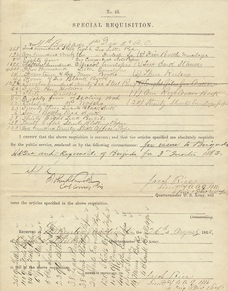 Lot of three signed documents, includes: JOHN R. BROOKE (1833 - 1916) Union brigadier general who commanded a division at Port Hudson and in the Army of the James, 1p. 4to., Aug. 7, 1863, a lengthy requisition for stationery supplies, also endorsed by JOHN BATCHELDER; FRANCIS E. PIERCE, A.E.S. at the bottom of a requisition, 1p. 4to., Washington, Jan. 31, 1866; and CHARLES W. SKINNER, commander of Navy vessels suppressing slave trade off West Africa, L.S. 1p. 4to., Washington, May 24, 1849 re: newspaper advertising. Three pcs., very good.