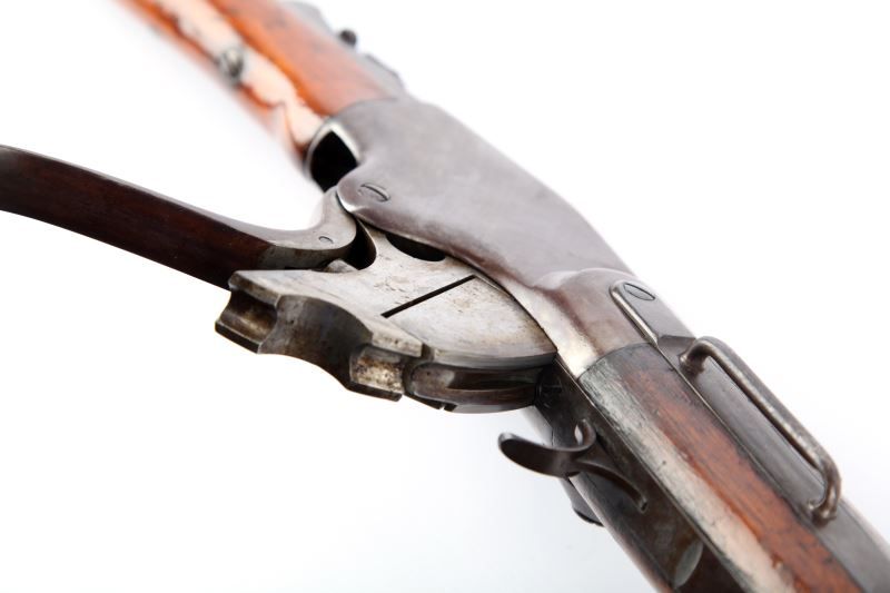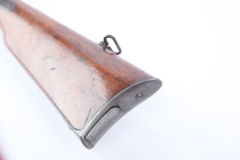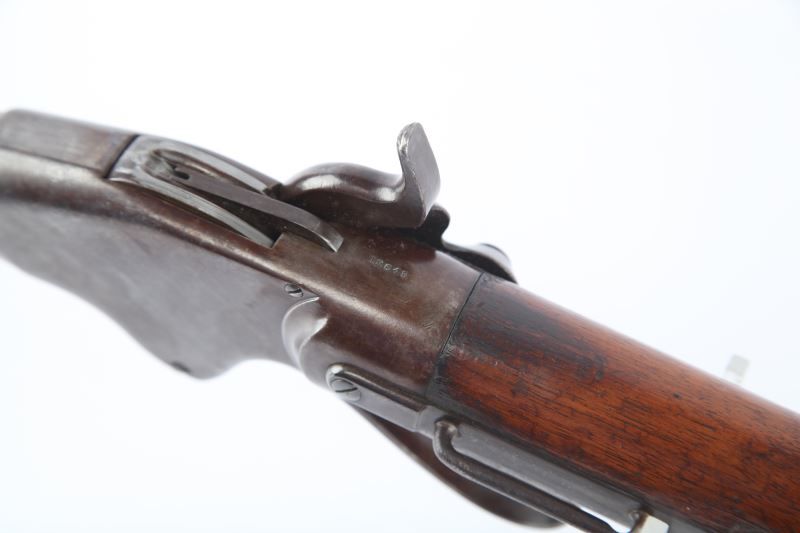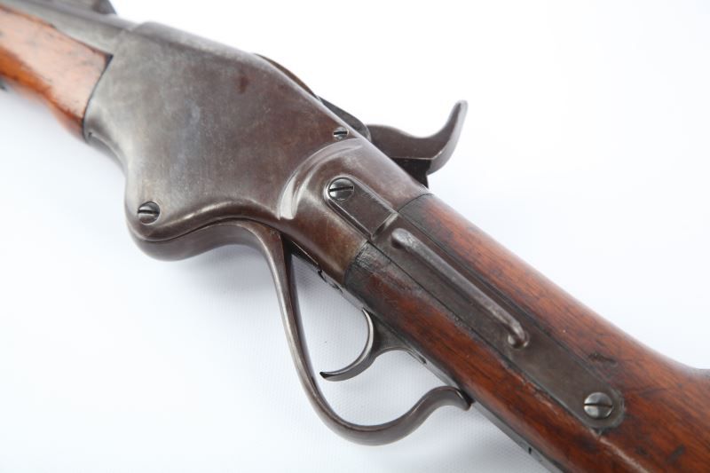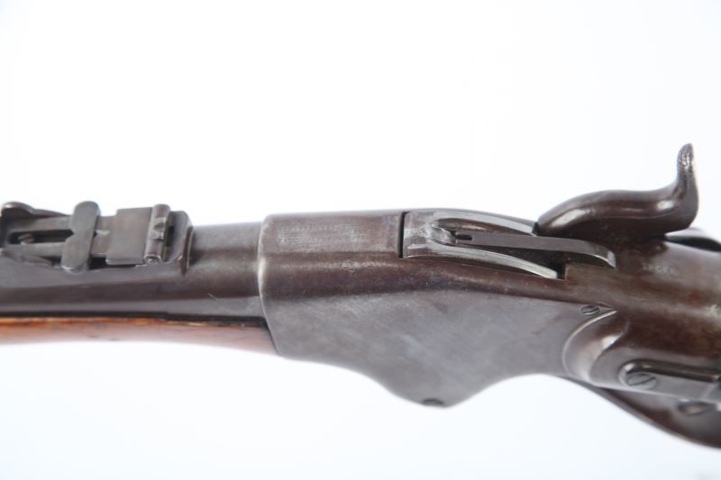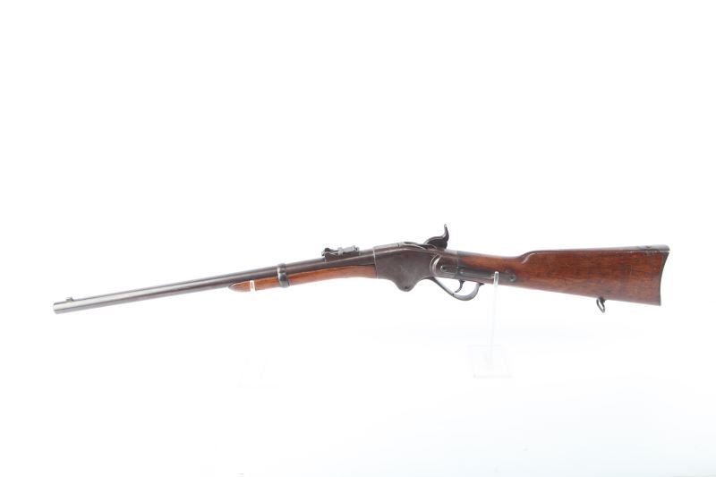 Spencer Repeating Carbine Civil War Model in .52 rimfire, with 22 inch barrel. Three line Spencer address & patent date stamped on top of receiver, just in front of breech, and small "H" inspection stamp marked on right side of barrel. Stock shows repairs to fore end, as well as likely re-finishing at some point, and cartouches are no longer visible. Saddle ring bar is present, but saddle ring itself is missing. Bore is very good, with some past pitting visible, but lands and grooves remaining well defined. Dark plum patina covering metal surfaces. Action remains smooth, and hammer pulls back with strong tight clicks. Overall good condition. Caliber: .52 Serial #: 12648