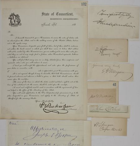 Lot of eight items signed by Civil War generals and other notables, includes cut signatures and signatures on cards of: JOHN G. NICOLAY, JOSEPH E. BROWN, WILLIAM SPRAGUE, JOHN A. ANDREW, QUINCY ADAMS GILLMORE, JOHN LETCHER, EDWARD D. MORGAN, and an unissued commission for an elector signed by WILLIAM A. BUCKINGHAM. Some items mounted, overall very good.