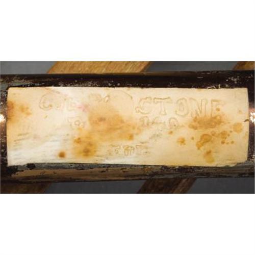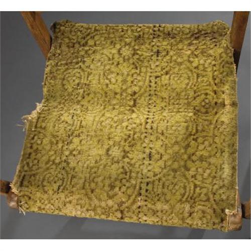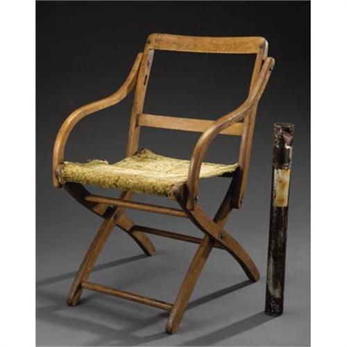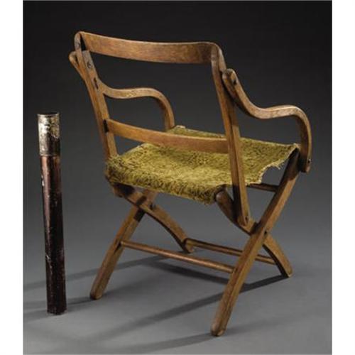 <B>CIVIL WAR OAK CAMP CHAIR & TIN MAP CASE ca 1860S.</B></I> <I>Folding Oak Civil War Camp Chair.</B></I> Hand made from bent oak. Features a replaced carpeted seat with slat back construction, one of the upper slates missing, and a split in upper top slat of chair. Oak has original patina. All joints are pinned with correct style of iron rivets. This chair stands 28.50" tall and 18.75" Wide. Also has cross reinforcements on the legs for a sturdier chair. Also included in a Civil War period map case retaining most of the original japanned finish. 20.75” x 2”. <BR><BR><B>Condition:</B></I> Both items, very good<BR><BR><b>Shipping:</b> Other (oversized items, group lo (<a target="_blank" href="http://www.heritageauctions.com/common/shipping.php">view shipping information</a>)