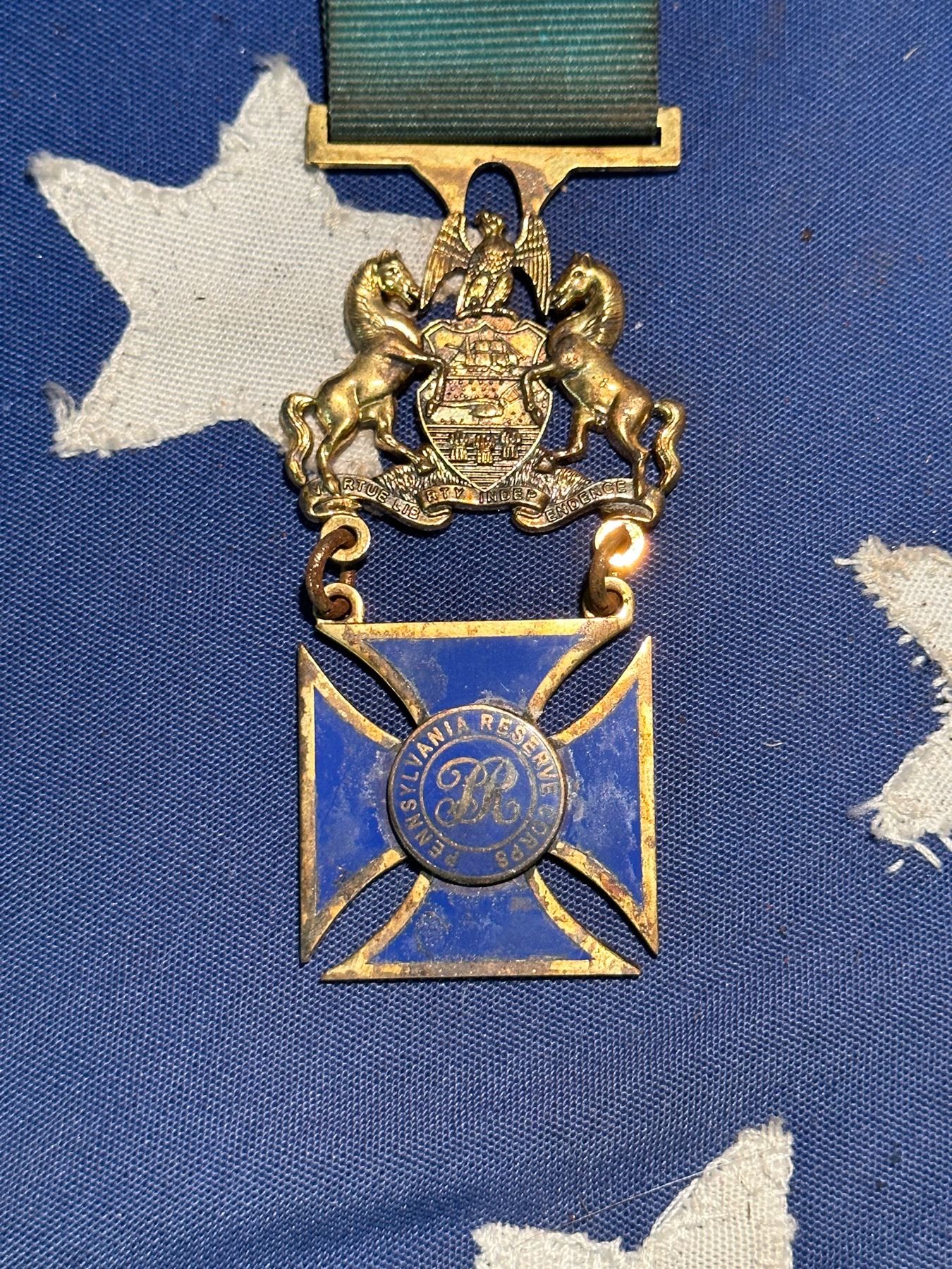 CIVIL WAR PA RESERVES WM. H.H. OGDEN SR. CORPORAL CO. B MEDAL WITH RIBBON. A RARE FIND. IT IS IN MINT OVERALL SHAPE AND CONDITION WITH A BEAUTIFUL OVERALL PATINA. A GREAT FIND AND AN EXCELLENT ADDITION TO YOUR COLLECTION. A VERY SCARCE FIND.