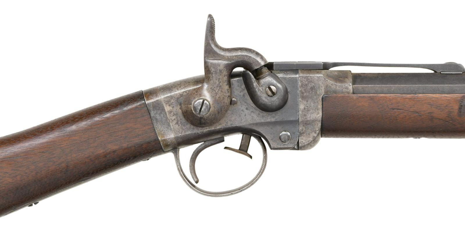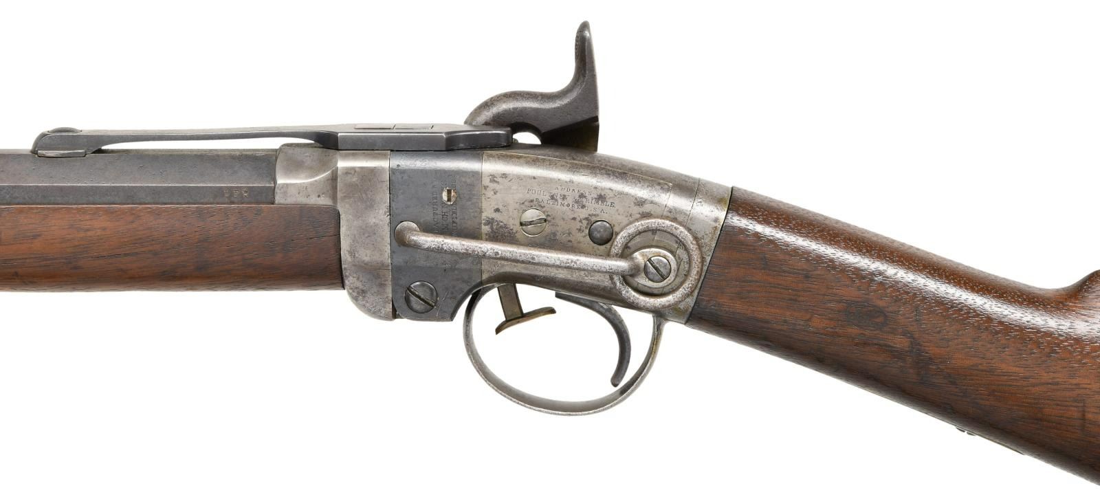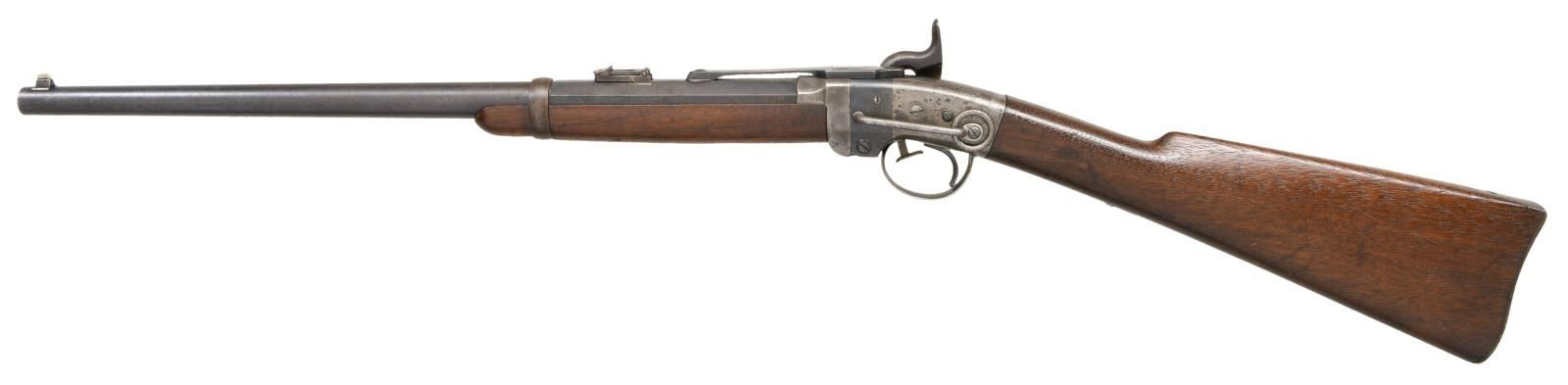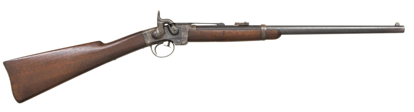 Cal. 50. S# 7866. Bbl. 20 1/4". This Smith carbine was manufactured by American Machine Works of Springfield, Massachusetts. It is a single shot percussion breech loading carbine. This example has a 20 1/4" blued, round to octagon barrel with a stepped, bladed front sight and a folding rear sight. The left facet of the barrel is stamped "LFR". It has a case-hardened frame with a 2 3/4" ring bar on the left side. The left side of the frame is marked "MANUFACTURED BY AM'N M'CH'N WKS SPRINGFIELD MASS." & "ADDRESS POULTNEY & TRIMBLE BALTIMORE U.S.A. SMITH'S PATENT JUNE 23, 1857". The walnut stock has a clear inspector's mark at the front of the left side. Iron butt plate, barrel band, & trigger guard with tang. CONDITION: barrel has substantial blued finish remaining with a few light oxidized areas and very minor pitting near the muzzle. Frame retains traces of case colors. Stock shows minor handling wear with a clear inspector's mark. Mechanics function well. Good bore. (01-23816/BF). ANTIQUE. $1,400-1,800.