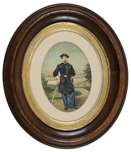 A unique item, a 5" x 7 1/2" Civil War-period oval watercolor painting of an unidentified Union officer standing with sword in one hand with the image of a camp in the background. Housed in a deep oval frame with gilt border. Painting bears a small tear at right, else overall fine condition. Not examined out of frame.
