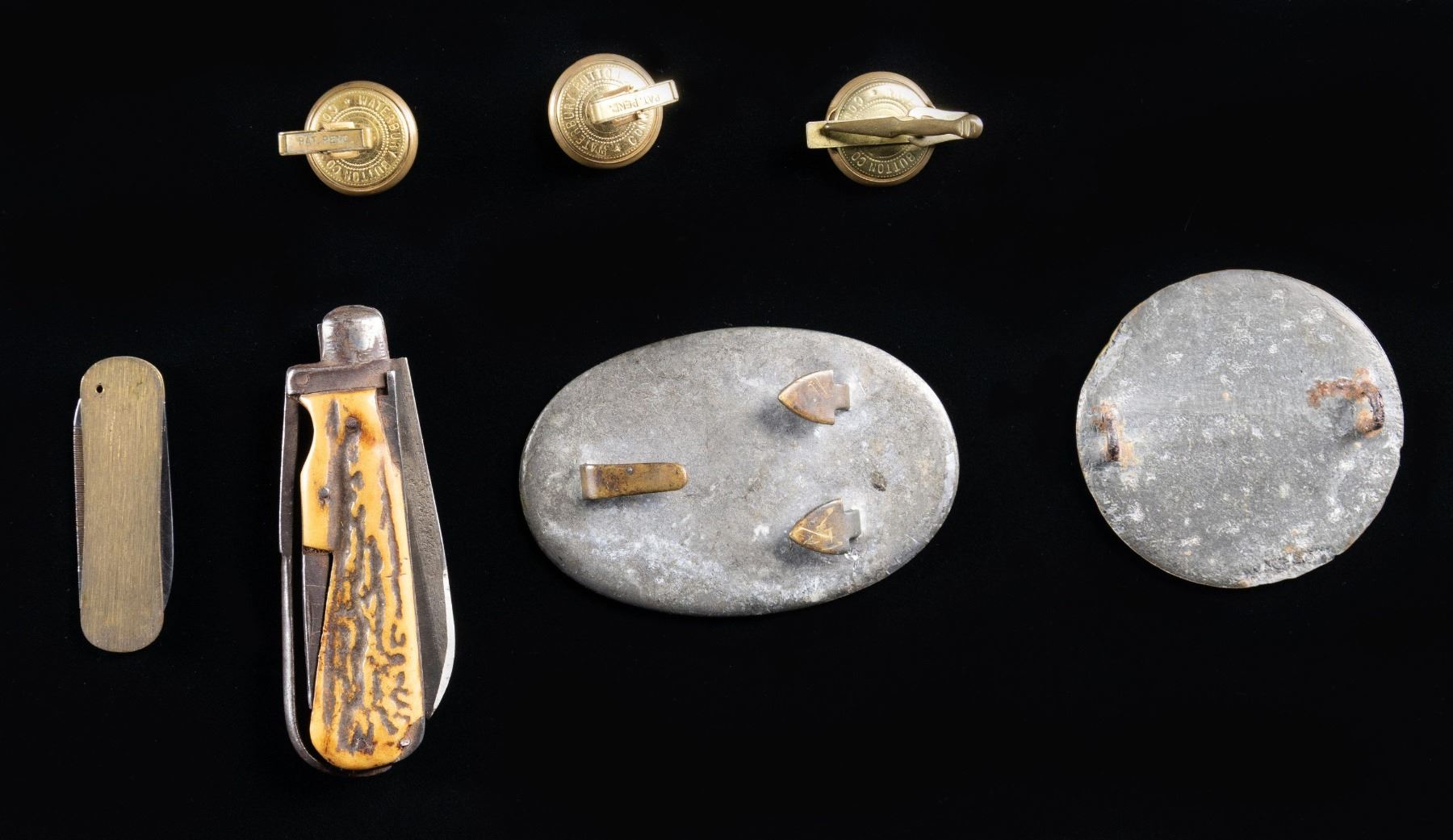 This lot contains 1 Civil war era round eagle cross belt plate. / 1 Civil war era "US" oval belt buckle. / 1 Brass folding knife of the 20th century. / 1 Stag grip folding knife of the 19th century with an interesting hook appendage. / 1 Tie bar and cufflink set of the 20th century made from reproduction "CSA" buttons. CONDITION: all items show light to moderate wear. (02-24138/BF). NON-GUN. $300-400.