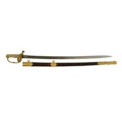 CIVIL WAR PRESENTATION NON-REGULATION STAFF AND FIELD OFFICER’S SWORD; CAPTAIN CHARLES WOLFF, 59TH NEW YORK INFANTRY. Wolff was born in 1822 and enlisted into the army on July 29, 1861 in New York City. He was appointed 2nd Lieutenant during the 59th New York Regiment’s recruiting period and joined Company C as its junior grade officer on September 18, 1861. He was promoted to Captain to serve as the company commander on November 11, 1862. Wolff was transferred to the Veteran Reserve Corps on September 10, 1863. No discharge date is listed. During Wolff’s term with the 59th New York, the regiment saw conspicuous action at Antietam, loosing 9 officers in front of the Dunker Church. The regiment next moved to Fredericksburg and took heavy losses. In May 1863 the 59th went to Chancellorsville prior to their march toward Gettysburg. In weakened numbers from their previous engagements the unit was consolidated into four companies, combined with the newly recruited 82nd New York Infantry and prepared for their march to Pennsylvania. They reached the Battle of Gettysburg and engaged the Confederates on July 2-3, losing a total of 6 officers and 26 enlisted men. Wolff was transferred to the Veteran Reserve Corps in September 1863. The reason for his transfer is not stated but may be due to a wound received. More research could be completed on this officer who served in some of the war’s most notable engagements. CONDITION: Very good. The blade is gray, having been cleaned once or twice but the etching remains strong. The hilt and brass furniture has a nice mellow patina. The grip is worn in three high spots, the scabbard quite nice. 4-53202 CW3