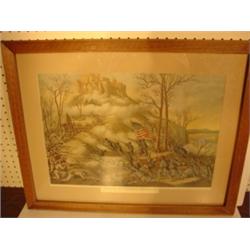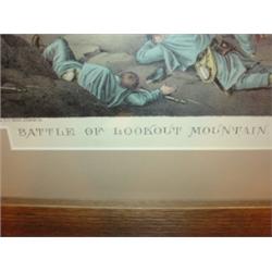 KURZ & ALLISON BATTLE OF LOOKOUT MOUNTAIN PRINT from lithograph. Depicts battle scene from Battle of Lookout Mountain, Nov. 24, 1863. 28.25" x 22" framed.