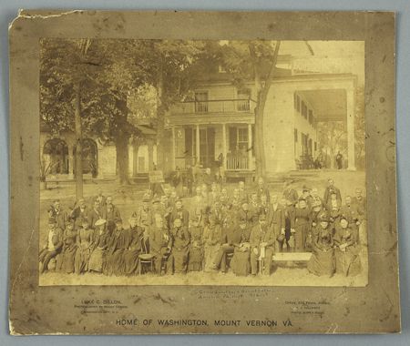 Large mounted albumen photograph 12 1/2" x 10" titled on mount "Home of Washington, Mount Vernon, VA" showing a large group of Union veterans and their families seated on the side of the mansion. One veteran has been identified in ink on the mount as "Grandmother & grandfather Amelia Philips Albert" Soiling and foxing to albumen and mount, small part of albumen worn where fingers had been pointed to 'Grandmother and Grandfather', some cracks and marginal faults, else good condition.