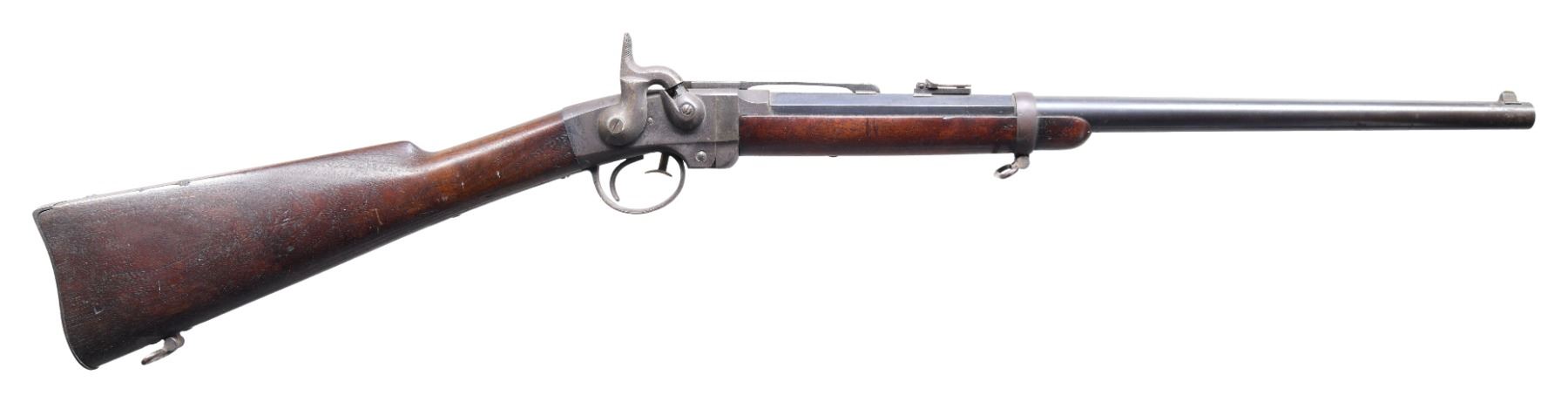 Cal. 50. S# 6675. Standard configuration for this popular breech loading saddle ring carbine, 21-5/8" octagonal to round barrel, iron mounted, case colored & blued. On the left side of breech is marked "ADDRESS / POULTNEY&TRIMBLE / BALTIMORE U.S.A."; "SMITH'S PATENT / JUNE 23 1857"; & "MANUFACTURED BY / MASS ARMS CO / CHICOPEE FALLS", both Mass Arms & American Machine Works made this contract, all purchased by US government, total production about 30,000. Some of the earliest serial guns were issued to 1st Mass Cav, 2nd WV Cav, 11th Ill Cav, 11th Ill cav. This proved to be one of the best carbines used during the war. CONDITION: very good condition, complete & original, all matching. Uncleaned and "as found" retaining considerable blue finish on barrel, frame has traces of case color under a stained and soiled layer, good markings, stocks are sound with scattered cosmetic blemishes, too bright cartouches. Mechanics are excellent w/bright shiny bore. (01-26331/JS). ANTIQUE. $1,200-1,500.