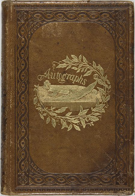 Autograph book presumably owned by a Civil War soldier who graduated from Canandaigua Academy, New York, approx. 80pp. 8vo., leather covers with gilt title and design, approx. half-filled with signatures including those of William H. Owen of the 77th NY and 5th U.S. Cav., Charles McMath, 2nd Mo. Cav., Samuel Holster, 6th U.S. Cav., Silas Seymour, 184th NY Reg., and Eli Woodward, 1st Michigan Light Arty (with small oval photo), and the legend "The Union Forever, Mar. 10, 1862" beneath his image. Other names also present, unresearched. Very good.