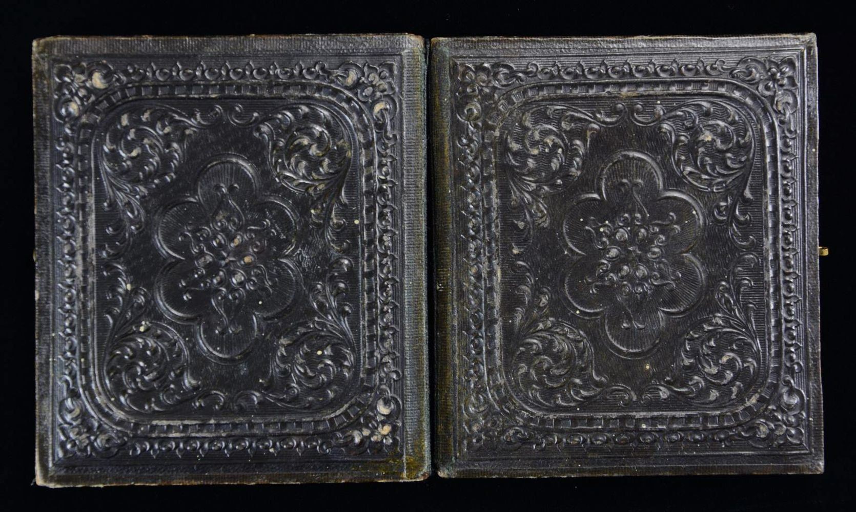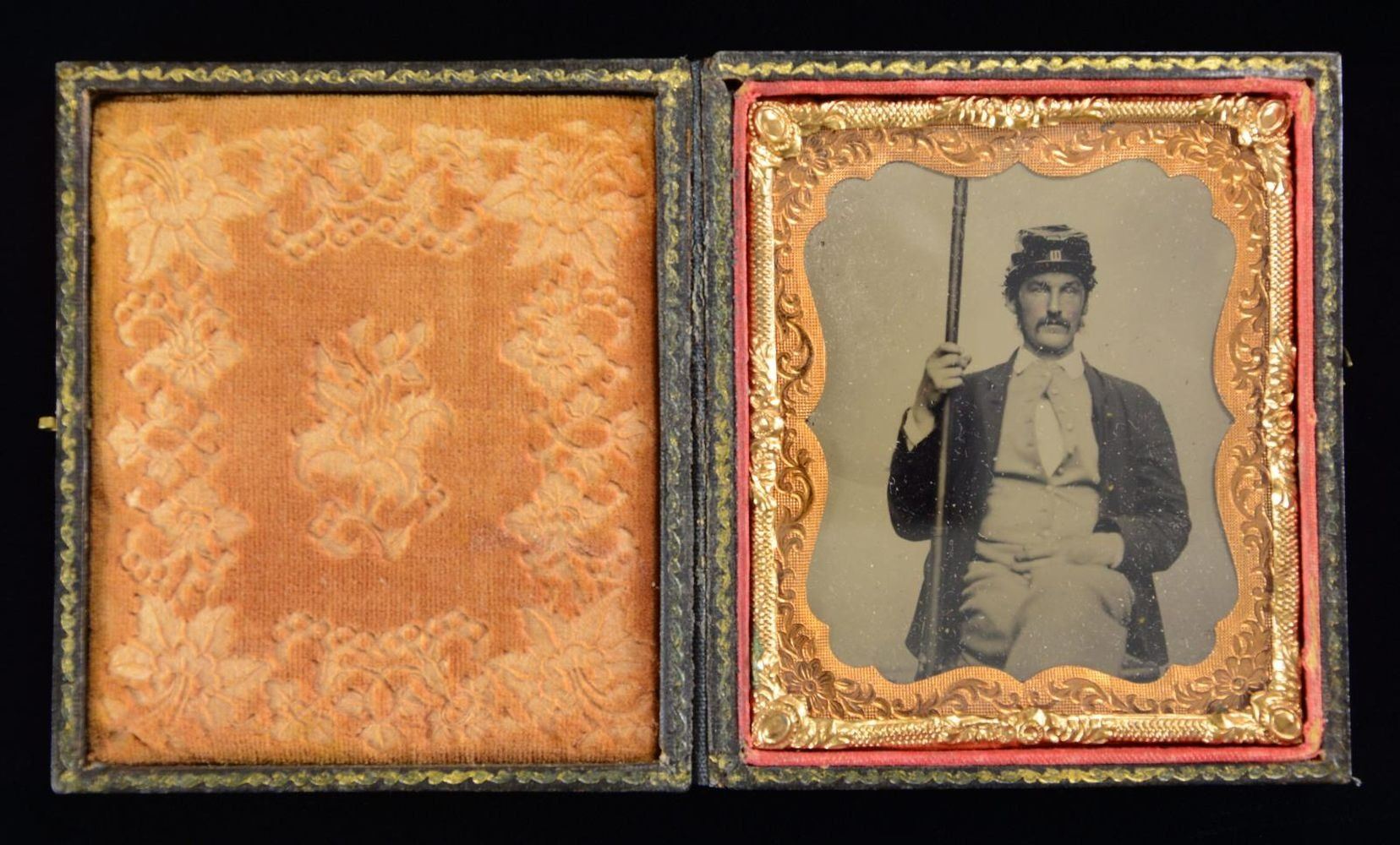 This 6th plate tintype depicts a knees-up view of a seated Infantry Private. He wears sky blue pants & vest with a 4-button sack coat over it. In his right hand is a musket. On his head is an interesting oil cloth kepi, often worn for rain protection. Gilded mat & frame with wood & paperboard case. CONDITION: image is exceptionally sharp with no visible problems. Mat & frame are crisp. Case is complete but has a tape reinforced hinge. (02-20982/BF). $350-500.