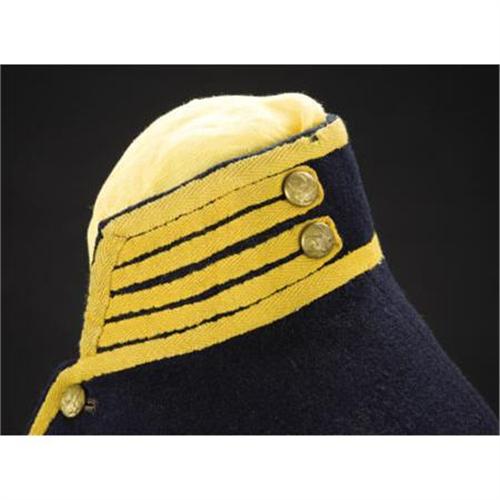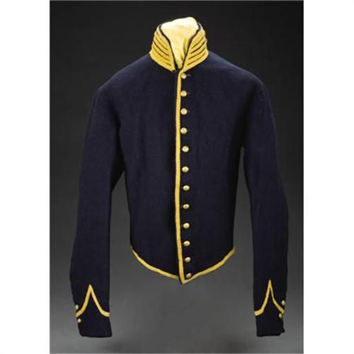 <B>CIVIL WAR UNION CAVALRY ENLISTED MAN’S SHELL JACKET.</B></I> In size “X1”, inspector “H. F. Harkness” and blurred maker’s mark in the sleeve lining. Original brown and red checkered body lining, white cotton sleeve linings. Probably the product of Schuylkil Arsenal. Retains the original “Scovills & Co. Extra” buttons with twelve on front, two on each side, and two on each split cuff, missing only one cuff button. Bright yellow worsted wool tape piping with original saber belt tufts/ supports at rear. The standard issue Union cavalry uniform jacket for enlisted men in both volunteer and regular establishment units which also saw service in the American west until the adoption of the 1872 uniform patterns. A very nice example of this attractive and desirable Civil War uniform jacket.<BR><BR><B>Condition:</B></I> A few small scattered repairs to moth holes on the body. One larger area of damage at the lower edge toward the back where the piping has been restitched, damage primarily to the inside and does not detract from the overall appearance of the jacket. Lining in both body and sleeves perfect.<BR><BR><b>Shipping:</b> Clothing, Costumes & Jerseys (<a target="_blank" href="http://www.heritageauctions.com/common/shipping.php">view shipping information</a>)