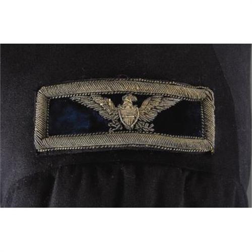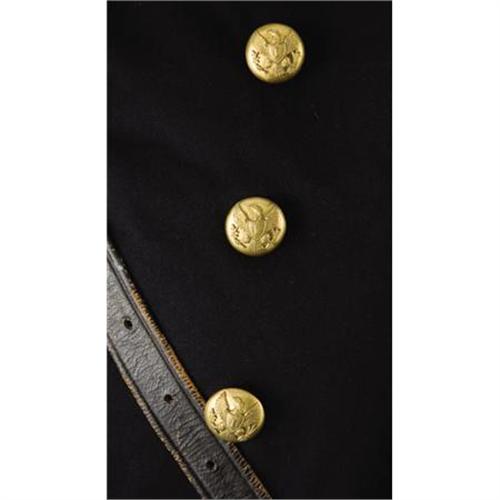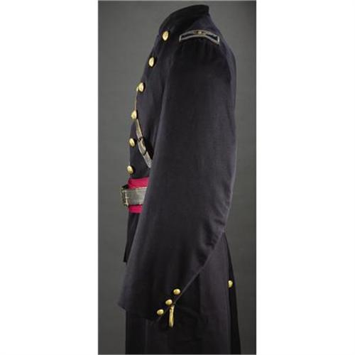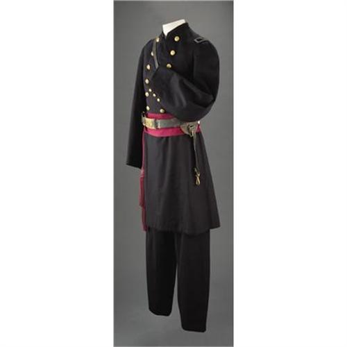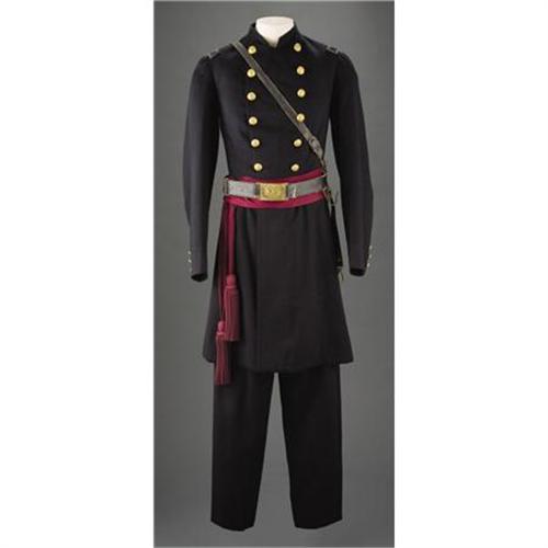 <B>MAGNIFICENT CIVIL WAR UNIFORM GROUPING OF COLONEL (BREVET BRIGADIER GENERAL) ORLANDO CHARLES RISDON, 53RD U.S. COLORED INFANTRY.</B></I> Risdon’s remarkable Civil War history begins with his enlistment in the three-month 19th Ohio Infantry on April 22, 1861. On October 7, 1861 he mustered in as a first lieutenant in the 42nd Ohio Infantry serving with this regiment until his promotion to lieutenant colonel of the 3rd Mississippi Regiment of African Descent (later the 53rd U.S. Colored Infantry) on May 20, 1863, having been wounded at Vicksburg on May 19. Risdon was appointed colonel commanding the regiment on March 24, 1864, and served in that capacity to the end of the war, being mustered out on June 6, 1866. This uniform obviously dates to that period. He was commissioned brevet brigadier general of volunteers on orders dated March 13, 1865, for “gallant and meritorious services in the battles of Rich Mountain (West Virginia), Middle Creek (East Kentucky), Tazeville (East Tennessee), Arkansas Post Chickasaw, Port Gibson, Champion Hill, Big Black Ridge and the Siege of Vicksburg.” <BR><BR>This beautiful grouping consists of Capron’s colonel’s frock coat, trousers, waist/ sword belt, sash and staff officer’s forage style cap. The exquisite quality blue wool frock coat is double breasted with a seven-button front. Retains all the original “S. & J./ London” eagle I buttons with separately affixed eagle I device. These are late war but unquestionably original to the coat and period. Fourteen coat size on breast, four on tails. Three cuff size buttons on each unsplit cuff. All buttons retain 95% of the original gilt. Breast pocket and pockets in the pleated tails are lined with high quality brown polished cotton. Black silk lining quilted in the breast, draped in the skirts, raw cut skirt edge. Wonderful period sleeve cut, 10” at elbows and 5” at cuffs, slightly tufted at the shoulders. Black velvet lined 1¼” high standup collar. Original maker’s label of “T. W. Sprague & Co./ Fourth St. Cor. Of Vine/ Cincinnati”. Original ID of small white polished cotton strip stitched under the label with “Col. Chas. Risdon” in period ink script. Original single border bullion colonel’s shoulder straps with dark blue velvet background. The dark blue wool trousers incorporate very narrow medium blue wool piping in the seam extending to the pocket edges. ¾” wide leather reinforcing on the inside edges of the cuffs, button fly, button on the corner of each pocket for closure. Split belted back with japanned brass buckle. Leather waist/ sword belt with superb quality M1851 rectangular eagle plate with toned wreath, stippled background, and medium width tongue. Retains both original sword slings and over the shoulder sling, with brass suspension hook. The maroon silk sash is 3½” wide with 8” tassels. The staff officer’s forage cap is probably the finest we’ve ever seen. Stands 4½” high at the front. Original staff officer’s insignia with blue wool back, double border brass wire border, old English silver bullion US inside the gold bullion wreath. Four 1/8” wide strips of black silk decoration around the base and on all four sides, quatrefoil on the crown inside of a circle. ½” wide gold bullion tape chinstrap with both original “Extra Quality” staff buttons. Visor (2” from front of body to edge of visor) tarred on the top and lined on the bottom with green Moroccan leather embossed with a diamond pattern. Brown polished cotton quilted lining with maker’s (“Paris”) embossed in crown. 1 3/8” wide maroon Moroccan leather sweatband with stitched edge. Certainly one of the finest Civil War Union staff officer’s groupings we’ve had the pleasure of offering with excellent provenance and history of service.<BR><BR><B>Condition:</B></I> The coat lining shows some minor signs of wear, most notable in the armpits. The buttonholes also show some signs of minor wear with a couple of loose stitches. One shoulder strap with a few loose strands of bullion on the corner, otherwise the coat is mint. Trousers show signs of honest wear at the cuffs with only about 60% of the original leather reinforcing remaining. One pocket button and front closure button missing, otherwise the trousers are also perfect. Sash very nice with no holes, fading or tears, just some minor wear on the tassels. Waist/ sword belt near mint as supple and sound as when new, just some minor wear on the edges. The exceptional forage cap has just one small moth hole on the body and one strip of slightly frayed black silk decoration at the back, otherwise the body of the cap is in superb condition and most impressive. The tarred finish on the top of the visor displays some crazing, but excellent. The quilted lining shows deterioration and is about 50% intact, with about 70% of the Moroccan leather sweatband remaining. Bullion tape chinstrap w/just some minor discoloration, otherwise perfect.<BR><BR><b>Shipping:</b> Clothing, Costumes & Jerseys (<a target="_blank" href="http://www.heritageauctions.com/common/shipping.php">view shipping information</a>)
