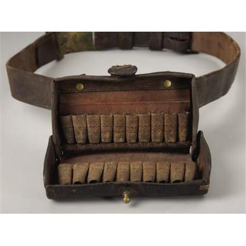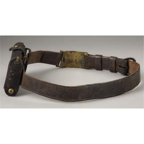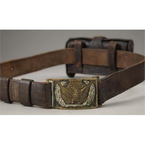 <B>CIVIL WAR VINTAGE BELT AND BUCKLE WITH LATER McKEEVER STYLE CARTRIDGE BOX</B></I> - Original Civil War three-piece eagle belt plate with keeper attached to a vintage non-regulation belt. Belt plate #440 and #769 hasp belt has a black iron roller buckle for adjustment. Belt and buckle look like they've been together forever. Two belt loops intact. Leather well worn, but soft and supple. Great age and patina on belt plate and keeper. McKeever box fits .45-70 cartridges. Cartridge box is cracked and crazed.<BR><BR><b>Shipping:</b> Miscellaneous Collectibles, Smal (<a target="_blank" href="http://www.heritageauctions.com/common/shipping.php">view shipping information</a>)