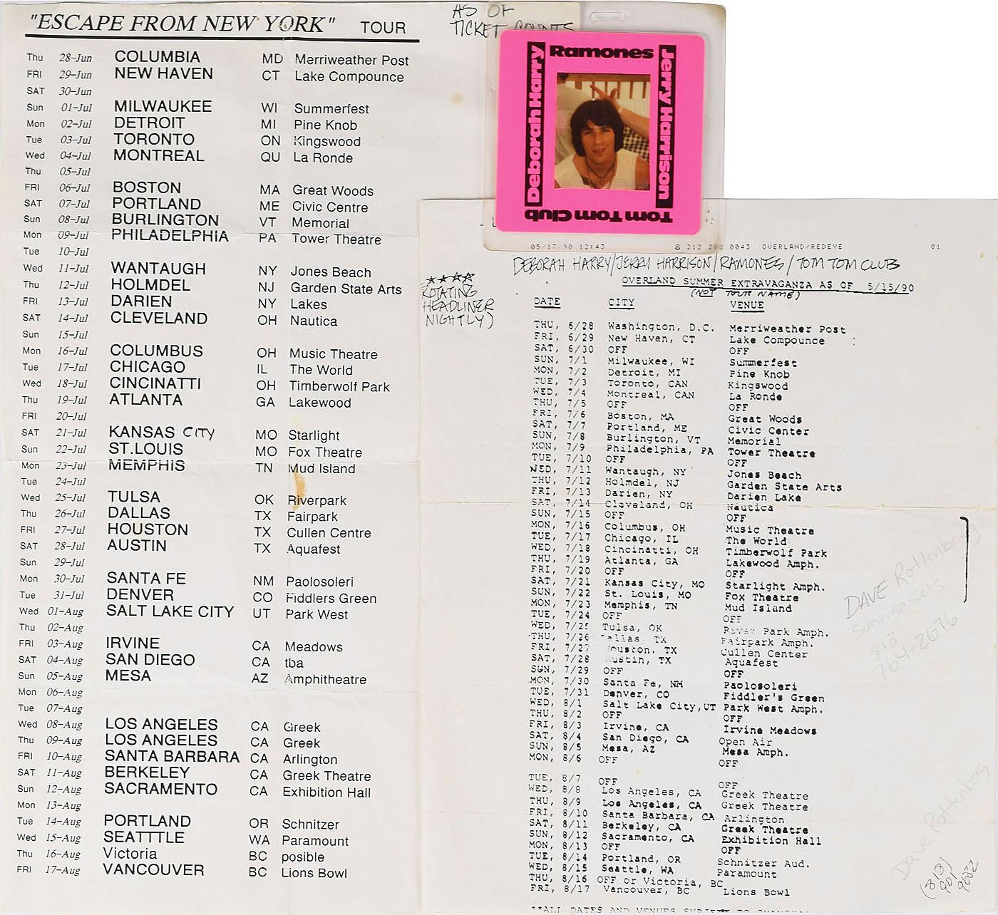 Three items from the personal collection of CJ Ramone: a laminated pink backstage pass issued to CJ Ramone for the 1990 Escape from New York tour, 3.5 x 3.75, featuring a color photo of Ramone surrounded by the names of the touring artists: Ramones, Jerry Harrison, Tom Tom Club, and Deborah Harry; and two copies of the 1990 Escape from New York tour schedule, 8.5 x 11 and 8.5 x 14, with each sheet listing 40 potential North American concerts dated between June 28 and August 17, 1990. The smaller sheet bears pencil and ballpoint notations, and the header reads "Overland Summer Extravaganza," with handwriting inherent to original version noting: "Not tour name," "Escape from NY," and "Rotating headliner nightly." In overall fine condition, with expected wear.