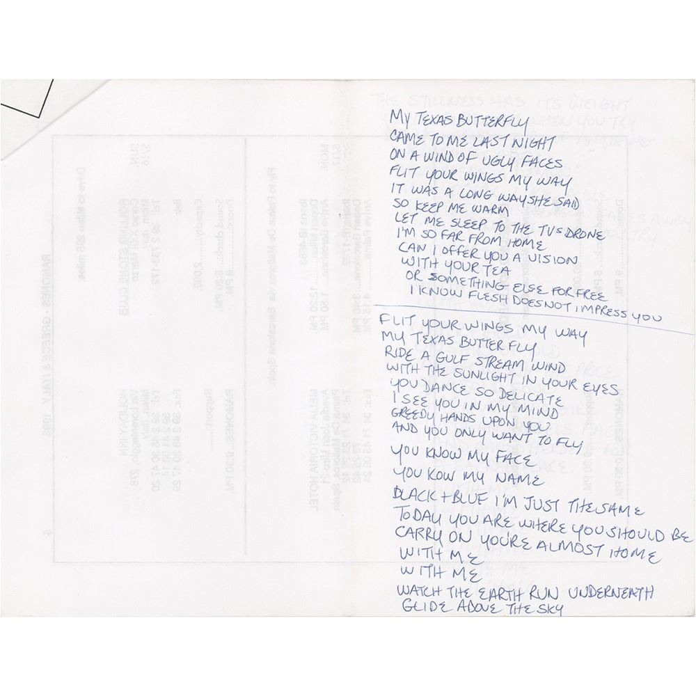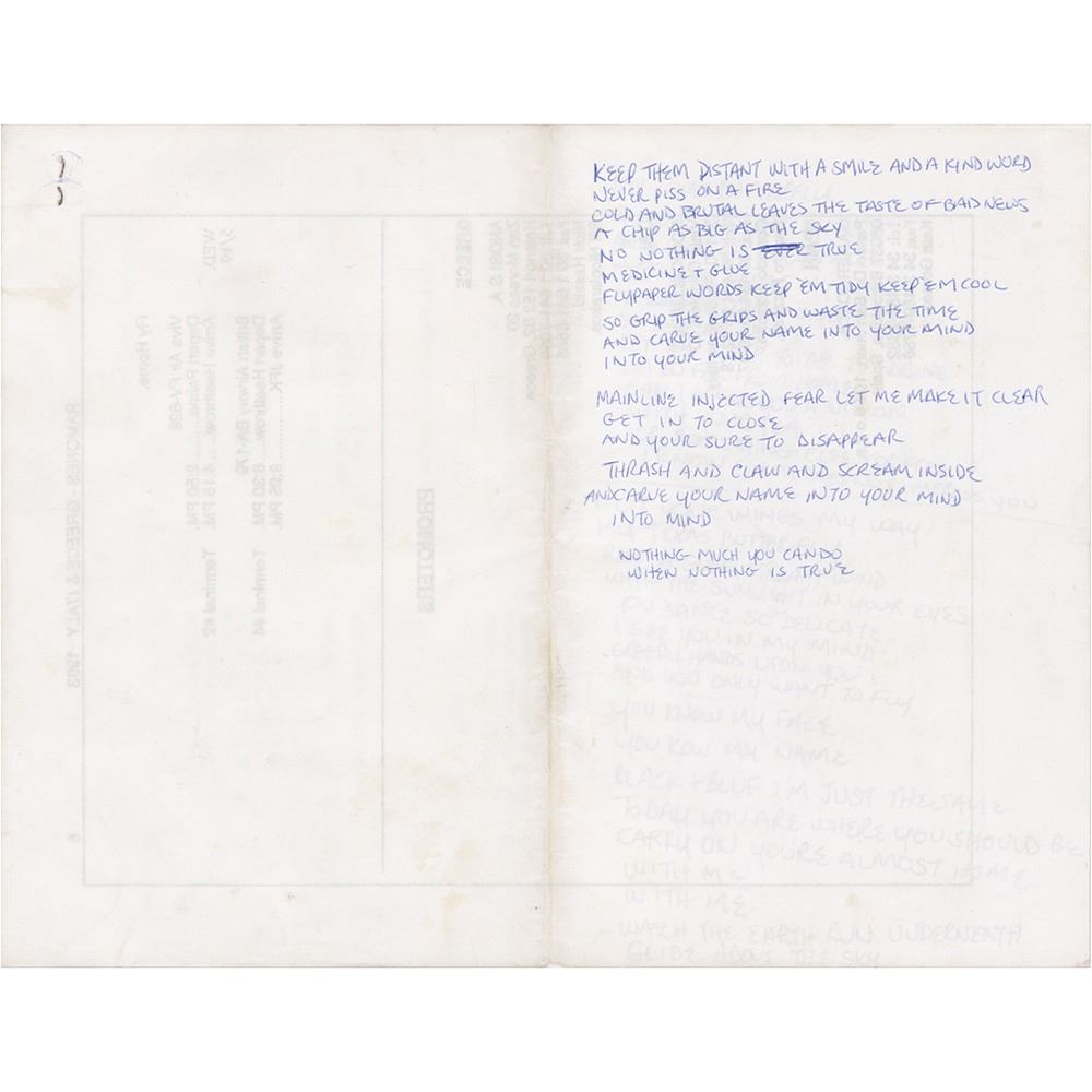 Handwritten lyrics by CJ Ramone for a pair of songs, penned in blue ballpoint on the backside of a Ramones itinerary packet, six pages, 8.5 x 11, containing details for their 11-concert tour of Greece, Spain, and Italy between May 5–18, 1993. Both songs are untitled, with Ramone writing one song on the reverse of the final page, and then another song on the preceding two pages. The first song, which became the Los Gusanos song ‘Carve Your Name,’ in full (grammar and spelling retained): "Keep them distant with a smile and a kind word / never piss on a fire / cold and brutal leaves the taste of bad news / a chip as big as the sky / no nothing is true / medicine & glue / flypaper words keep'em tidy keep'em cool / so grip the grips and waste the time / and carve your name into your mind / into your mind / Mainline injected fear let me make it clear / get in to close / and your sure to disappear / thrash and claw and scream inside / and carve your name into your mind / into mind / nothing much you can do / when nothing is true." The second set of lyrics: "My Texas butterfly / came to me last night / on a wind of ugly faces / flit your wings my way / it was a long way she said / so keep me warm / let me sleep to the TVs drone / I'm so far from home / can I offer you a vision / with your tea / or something else for free / I know flesh does not impress you / Flit your wings my way / my Texas butterfly / ride a Gulf Stream wind / with sunlight in your eyes / you dance so delicate / I see you in my mind / greedy hands upon you / and you only want to fly / you know my face / you kow my name / black & blue I'm just the same / today you are where you should be / carry on you're almost home / with me / with me / watch the earth run underneath / glide above the sky / the stillness has its weight / you'll find out when you try / you can't be sure of anything / everythings a lie / sincerity's a demon / and lethal like a lie / the voice of reason fades away / you'll find out when you try / with me [4x] / copper & gold / on ships of old / aren't worth the price / of a solid soul / that lives in a girl / with an angels face / and saves herself for / a sacred place / with me… [6x]." Also includes an itinerary calendar for a Ramones tour of Germany in December 1993, bearing various pencil and blue ballpoint notations. In fine condition, with expected wear.