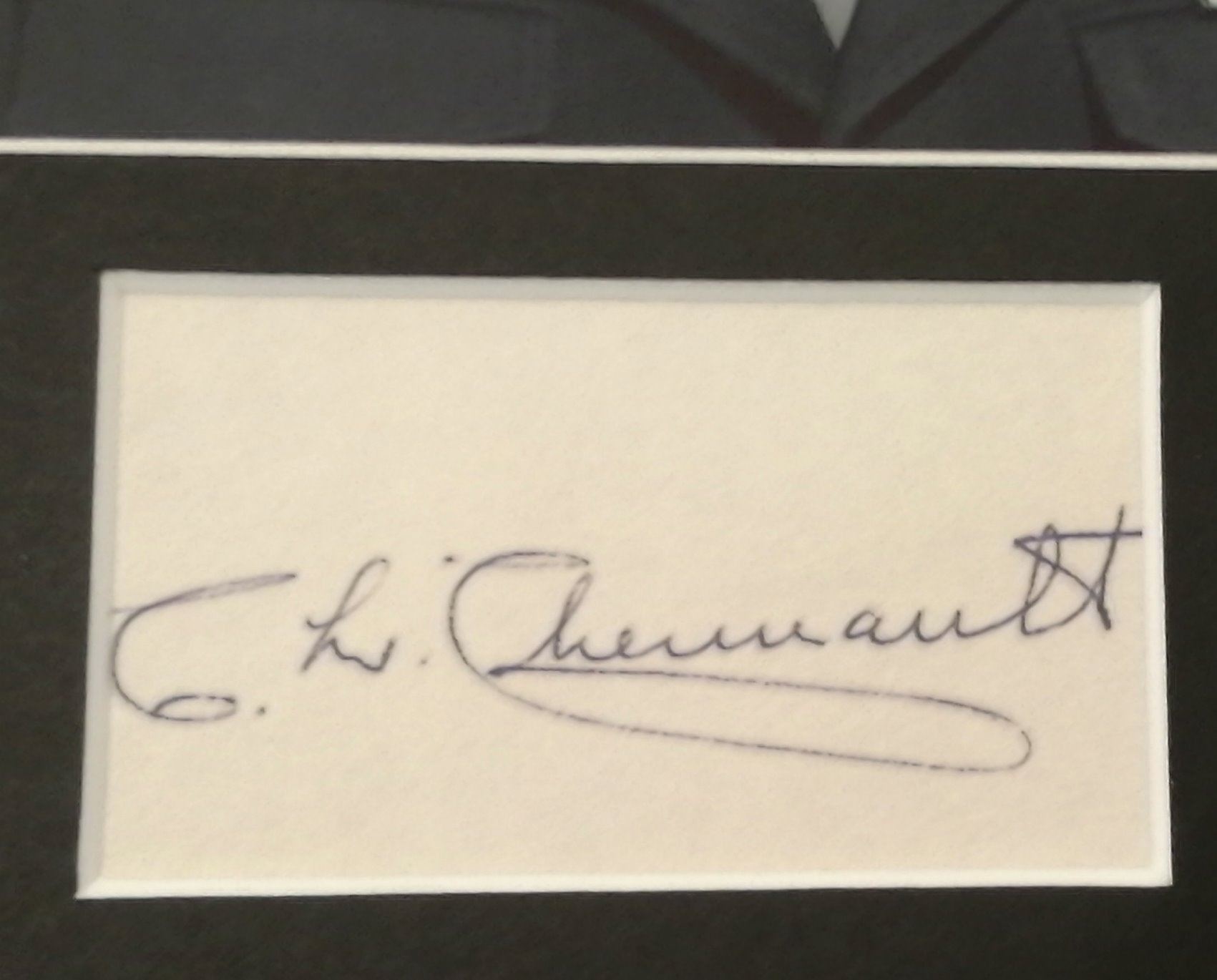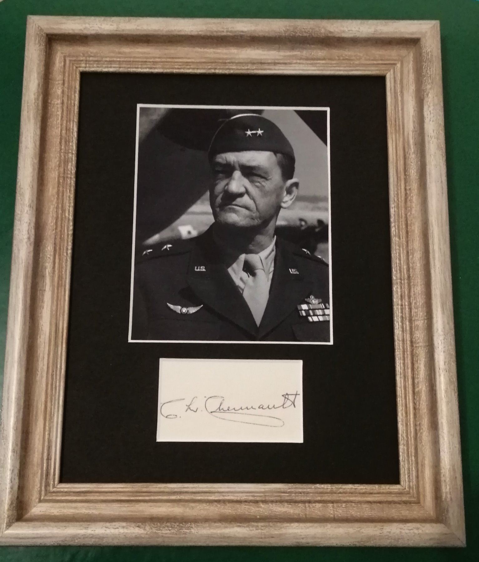 Claire Lee Chennault was an American military aviator best known for his leadership of the "Flying Tigers" and the Republic of China Air Force in World War II. Claire's autograph is mounted and framed and supplied with coa.