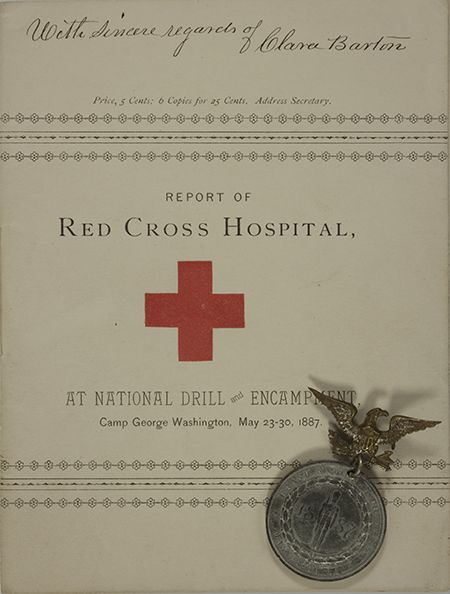 (1821 - 1912) American nurse who tended the wounded in the Civil War and later founded the American Red Cross.A great signed item, Barton's Report of Red Cross Hospital at National Drill and Encampment, 20pp. 8vo., (Washington: Rufus H. Darby), 1887. Front cover bold signed at top: "With sincere regards of Clara Barton". Fine. From May 23-30, 1887 Civil War veterans from around the country gathered at Camp George Washington, near Washington, D.C. to parade, attend speeches, and meet old comrades (and enemies). Barton set up field hospitals to tend to any injured or sick veterans who at the time would be at least in their mid-forties. The report describes the preparation for the encampment, and shows that 186 men were treated, 44 for sunstroke, and 306 prescriptions were prepared. Sold with a medal given to those who attended the event.