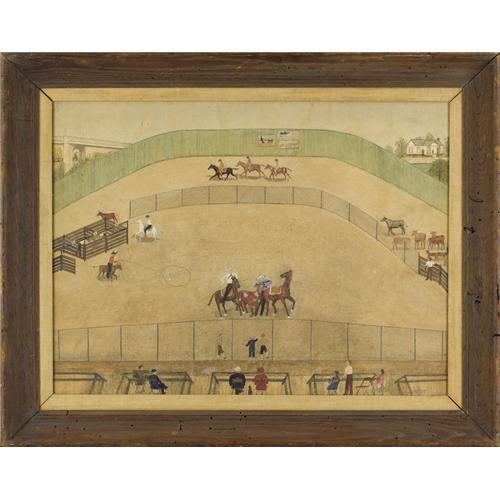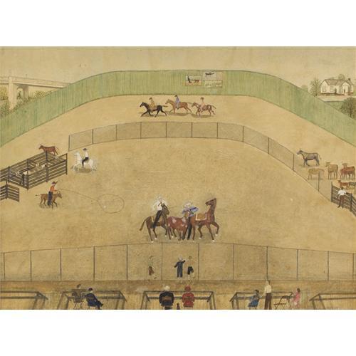 <B>CLARA MCDONALD WILLIAMSON (1875-1976)</B></I><BR><I>Rodeo,</B></I><BR>Watercolor<BR>22 1/2in. x 29 1/2in.<BR>Signed lower right<BR><BR>Primative artist Clara McDonald Williamson was born in 1875 in Iredell, Texas, and lived to be one hundred years old. She took up painting in 1943, at the age of sixty eight. While taking classes at the Dallas Museum of Art she came to the attention of Jerry Bywaters, who encouraged her to paint in her naive manner instead of trying to learn a different style. By 1945, she was winning local competitions, and in 1946 she exhibited a painting at the National Academy of Design. She painted her memories of people, places, and events in Iredell, as well as Waxahachie, and Dallas. Her work is in the collections of the Amon Carter Museum, the Dallas Museum of Art, and the Wichita Art Museum. She exhibited at the Dallas Museum of Art, Elizabet Ney Museum, Amon Carter Museum, Metropolitan Museum of Art, Terry Art Institute, University of Illinois, Smithsonian Institution, Baltimore Museum of Art, Carnegie Institute, Philbrook Museum, and Southern Methodist University. She was known to have painted only 160 paintings in her life.<BR><BR>This painting, <I>Rodeo,</B></I> was first shown at the Alan Gallery in New York. It was also included in Williamson's Retrospective at the Amon Carter Museum.<BR><BR>Exibited:<BR>The Alan Gallery, New York, 1954 (label attached verso); Amon Carter Museum, Clara Williamson Retrospective (label attached verso).<BR><BR> <B>Condition Report:</B> Excellent original condition - surface would benefit from a cleaning. Scattered minor inpainting. Period frame in excellent condition.<BR><BR><b>Shipping:</b> Requires 3rd Party Shipping (<a target="_blank" href="http://www.heritageauctions.com/common/shipping.php">view shipping information</a>)