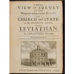 CLARENDON, EDWARD EARL. A BRIEF VIEW AND SURVEY OF THE DANGEROUS AND PERNICIOUS ERRORS TO CHURCH AND STATE, IN MR. HOBBES'S BOOK, ENTITLED LEVIATHAN. Second impression. [viii], 322. Illustrated with engraved frontispiece and chapterpieces. Lrg. 8vo, full calf, front cover detached, bookplate, else very good. Wing C4421.
