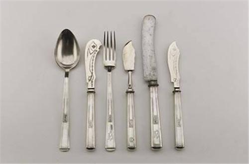 Josef Maria Olbrich<BR> Besteckkonvolut,<BR> Plated. 9-tlg., bestehend aus 4 Esslöffeln, einem Messer, einer Gabel, einem Buttermesser, einem Fischmesser und einem Vorlegemesser. Schäfte mit linearem Reliefdekor. L.: 22,9 - 26 cm. Bez.: Alle Teile mit Künstlerinitialen vorderseitig auf dem Schaft, einige mit Monogramm. 1902<BR>