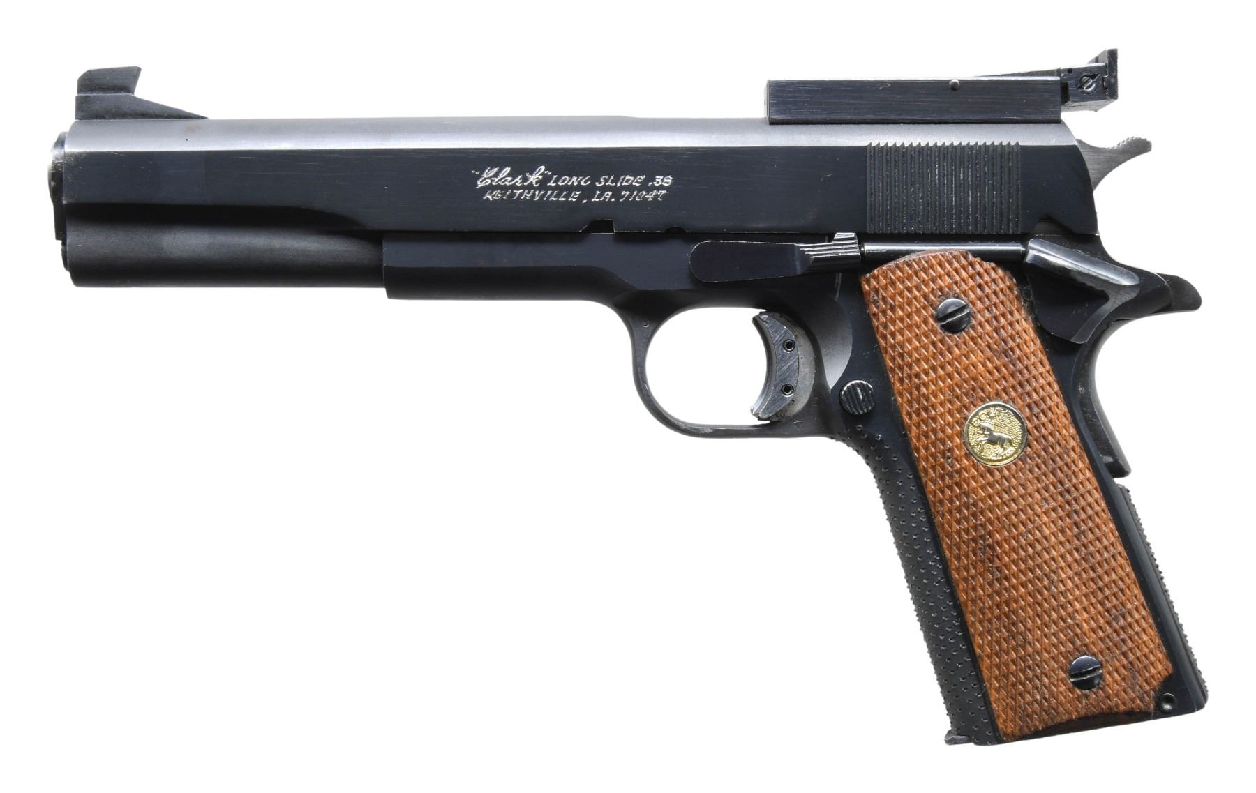 PISTOL. Cal. 38 Spl. (Mid Range Wadcutter). S# 70L27061. Bbl. 6". Patridge front sight. Bo-Mar adjustable rear sight. Underside of slide has "061" which matches last three digits of frame & "6 89" likely denoting June, 1989 date. Left side of slide has white Clark Long Slide markings with Keithville, LA address. Trigger shoe present. Blued finish. Colt series 70 frame with stippled grip straps. Checkered walnut grips with gold Rampant Colt medallions. MAGS: 1-5 rd. Colt made. CONDITION: grips show some handling marks & finish loss. Metal retains 95% blue with a small slide stop reassembly scratch on left side of frame, some edge, handling & operational wear. Action functions properly when hand cycled. Very good bright bore. (25-3307/MJC). MODERN. $1200-1800.