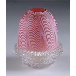Lot 36 CLARKES FAIRY LAMP Nailsea type decoration, white on cranberry with satin finish. Signed “Trademark Cricklite Clarkes”. SIZE: 4-3/4” t. CONDITION: Roughage to top of shade, otherwise very good. 5-70493