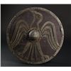 The shield is made of wood and features a bird motif made of pinned metal banding on the shield's face, which has been finished to replicate the appearance of worn, beaten iron. Leather handles are attached to the rear. The shield displays some wear, with scratches to the finish of the metalwork and wood from use and subsequent display. Wire has also been attached on the rear for display purposes. Dimensions: 11 cm x 66 cm x 66 cm (4 1/2'' x 26'' x 26'')