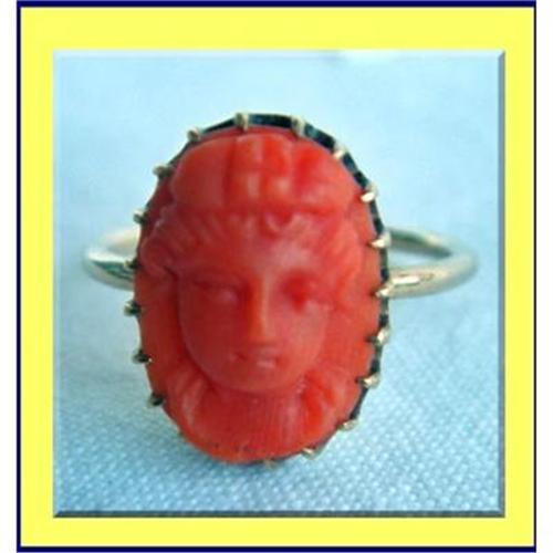 Classic antique Victorian 14 carat gold ring with a carved coral woman's face, possibly dating to Ancient Rome, mounted during the early Victorian period .