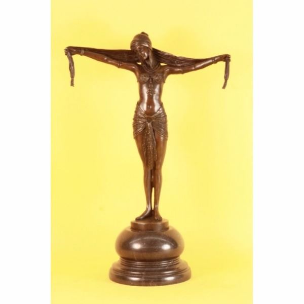 Her arms are out stretched wide as she holds on to her scarf letting the ends dangle from her hands. This gorgeous Gypsy performs her classic belly dance, letting strangers fall in love with the sight of her. Her curvaceous body is astounding and her outfit shows it off beautifully. She has a gorgeously and well proportioned body. She is absolutely beautiful and has gorgeous details; if you look you will see the detail on the necklace, beaded top, her tassel that falls on to her stomach and even her hands and feet. This sculpture was cast using the "Lost Wax Method" and has a two tone brown patina. She is mounted on a rounded beveled black marble base. This sculpture is 100% bronze and handmade and signed D.H Chiparus.Demetre Haralamb Chiparus (also known as Dumitru Chiparus; 16 September 1886, Dorohoi, Romania - 22 January 1947, Paris, France) was a Romanian Art Deco era sculptor who lived and worked in Paris. He was born in Romania, the son of Haralamb and Saveta. In 1909 he went to Italy, where he attended the classes of Italian sculptor Raffaello Romanelli. In 1912 he traveled to Paris to attend the Ecole des Beaux Arts to pursue his art at the classes of Antonin Mercie and Jean Boucher. Demetre Chiparus died in 1947 and was buried in Bagneux cemetery, just south of Paris.Condition: This sculpture is in a very Good condition. Bronze Dimensions with Marble Base:Height15 1/2" x Width10"Marble Dimensions: Diameter 5"Height without base:12 1/2" Weight :10 LBS Her arms are out stretched wide as she holds on to her scarf letting the ends dangle from her hands. This gorgeous Gypsy performs her classic belly dance, letting strangers fall in love with the sight of her. Her curvaceous body is astounding and her outfit shows it off beautifully. She has a gorgeously and well proportioned body. She is abso