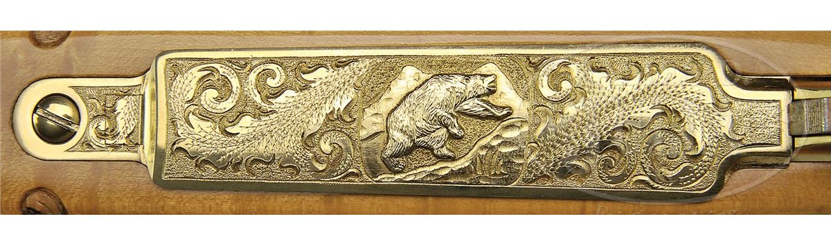 PLEASE NOTE (10-10-13): Additional Information: Gun is accompanied by a Weatherby Certificate of Authenticity listing the gun’s many custom features as ordered June 11, 1968. SN P26943. Cal. .300 Weatherby mag. Standard configuration with 24" round, light weight bbl is marked with caliber and "Made in W. Germany" at rear. Blued action and bbl are engraved with large attenuated scroll having stippled background. Left side of action is marked with "MARK V" and with patent information, along with "Weatherby". Bottom metal is gold-plated, engraved to match action and bbl, and has a full relief grizzly bear on center of floorplate. Typical Weatherby style birds-eye maple stock features ebony framed rosewood inlay on right side, white line rosewood grip cap and forend tip, white line open sided brown Weatherby pad, and right hand swept cheekpiece. In place of checkering, grip and forend are relief carved in well done acanthus scroll with stippled background. A gold lozenge engraved with initials "JRE" is surrounded by ebony inlay on bottom of forend. A Weatherby 2-3/4 - 10 X scope with fine crosshair reticle is in engraved QD rings. Weight with scope: 9 lbs. 7 oz. CONDITION: Excellent, possibly unfired, retaining nearly all its orig finish on wood and metal, with one or two small marks, most notably a spot on right side of bbl near muzzle, and a few barely mentionable marks on stock. There is some loss to gold-plating on swivel studs. Gold on bottom metal is excellent. Scope is excellent with clear optics. 4-47792 MGM8