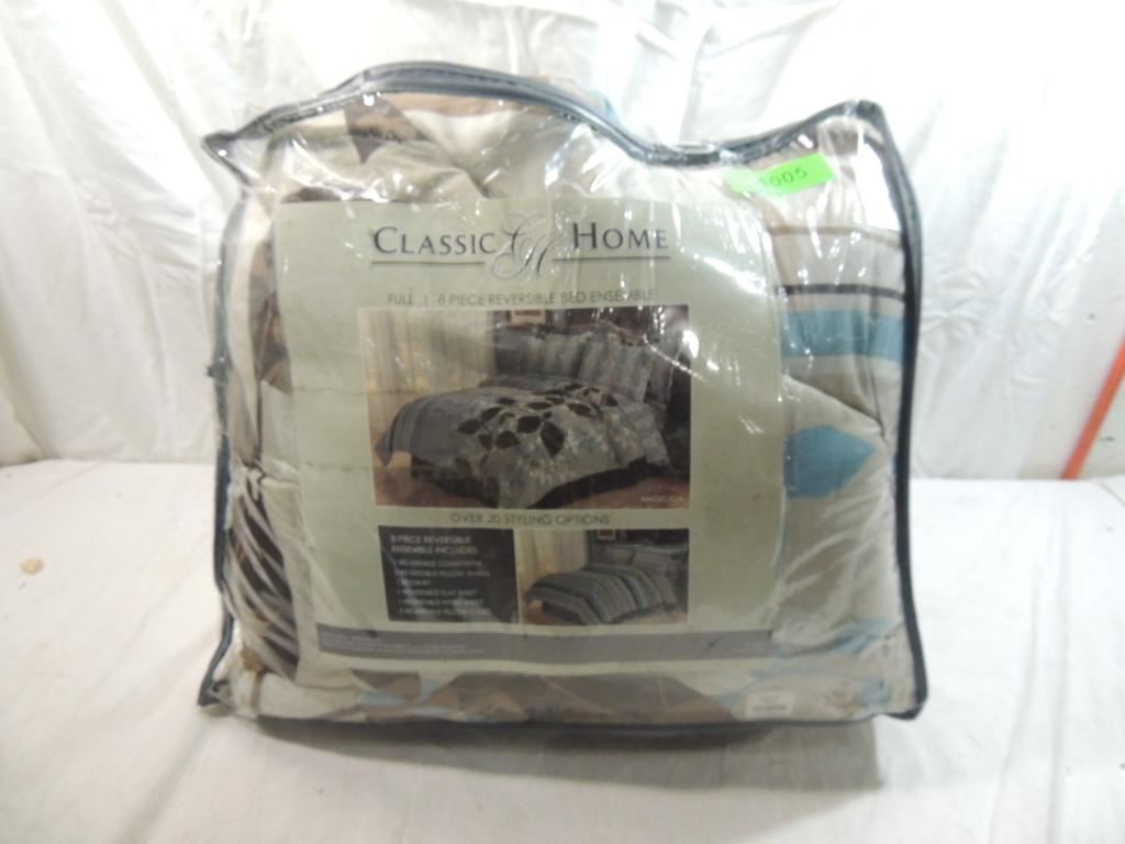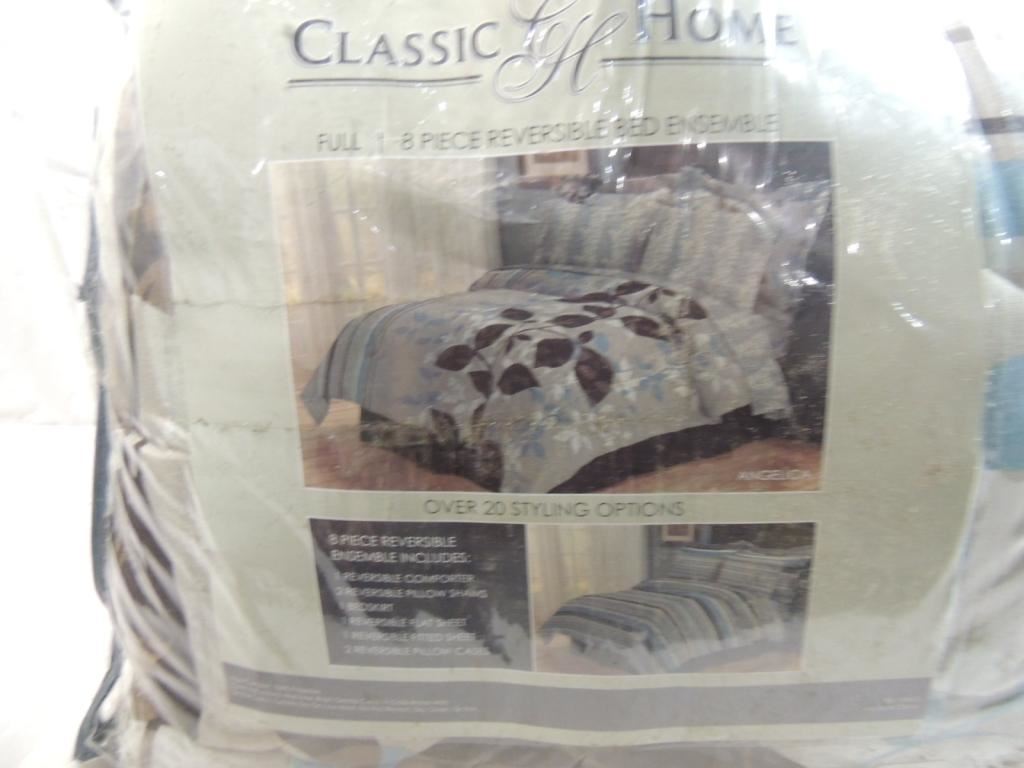 FULL SIZE, CLASSIC HOME 8 PIECE REVERSIBLE BED ENSEMBLE, COMFORTER, PILLOW SHAMS, BEDSKIRT, FLAT SHEET, FITTED SHEET, PILLOW CASES, AS SHOWN SEE PHOTO FOR MORE DETAILS.