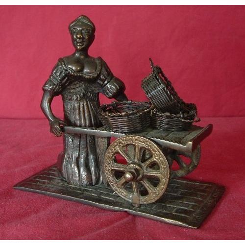 This is a rare Bronze Paperweight of MOLLY MALONE WITH CART. As the song says, during daytime Molly was a fishmonger selling cockles and mussels, but during nighttime, she changed her fishmonger clothes for some more revealing things, stilettos and fishnet tights. This is modeled after the famous Molly Malone bronze statue on the corner of Grafton and Suffolk Street in Dublin. This bronze sculpture is well-modeled, cast in deep relief, and has a nice patina. This figural Molly Malone is in classic ensemble dress including a revealing bodice top. She holds a well-detailed cart with two large wheels and topped with three empty wicker-style wire baskets. These are attached to a rectangular shaped plinth base by four screws. The base top is detailed with brick pavers, and the words MOLLY MALONE; the underside of the base is unmarked. This Bronze Paperweight measures (in inches): 5.0 Tall X 5.4 Wide X 2.6 Deep, and weighs 2 Lbs. 0 Oz. It is in very good condition with no repairs or restorations. The date is mid 20th Century. Shipping and Insurance USPS Priority Mail within the U.S. is $10.00 Thanks for looking and good luck bidding!